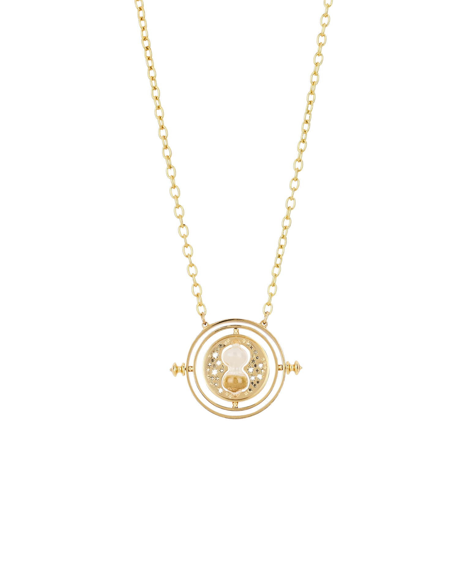 A replica pendant necklace featuring a beautiful design faithful to the original Time-Turner. Gifted to Hermione Granger by Professor McGonagall, the Time-Turner is a magical device that allows whomever is wearing it to go back in time.