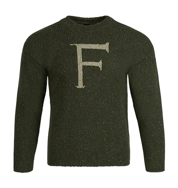 The jumper features a bold initial ‘F’ knitted into the front on a green coloured material.