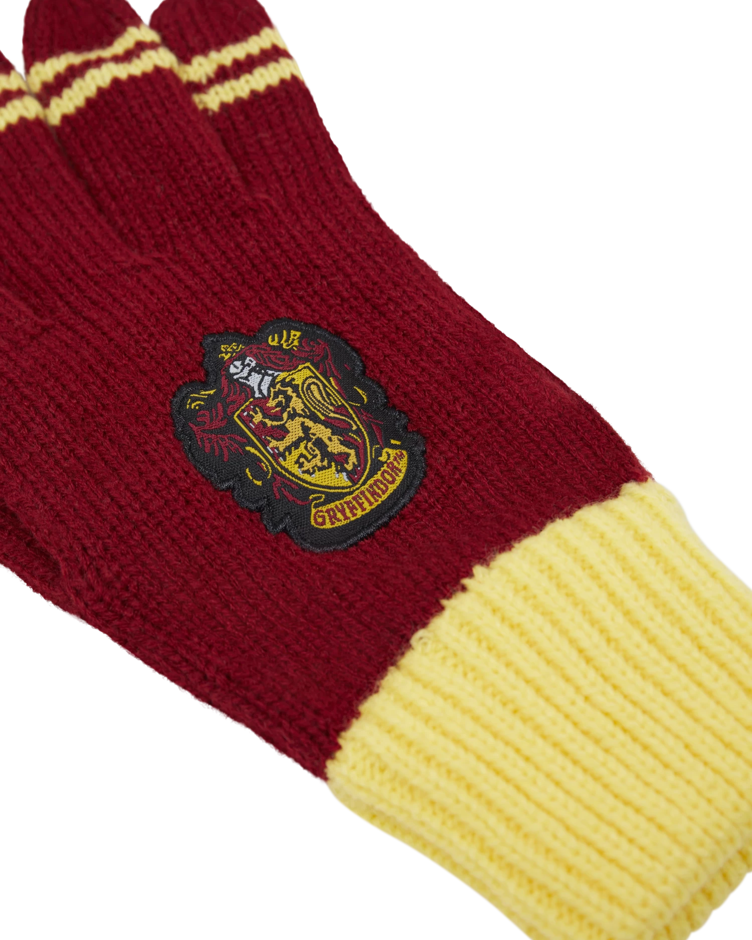 Keep warm and complete your Hogwarts school look with this striped knitted pair of Gryffindor gloves. Both gloves come in the traditional Gryffindor colours of red and yellow and feature an embroidered patch of the Gryffindor crest. The gloves are complete with two yellow stripes on the end of each finger, and yellow cuffed wrists for comfortable wear.