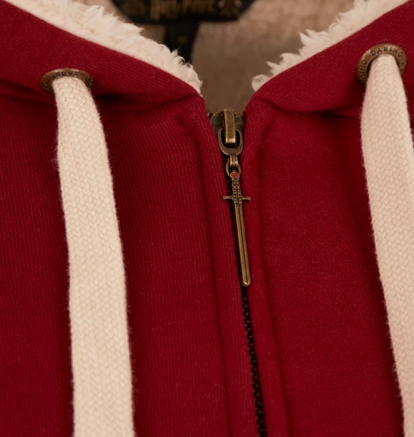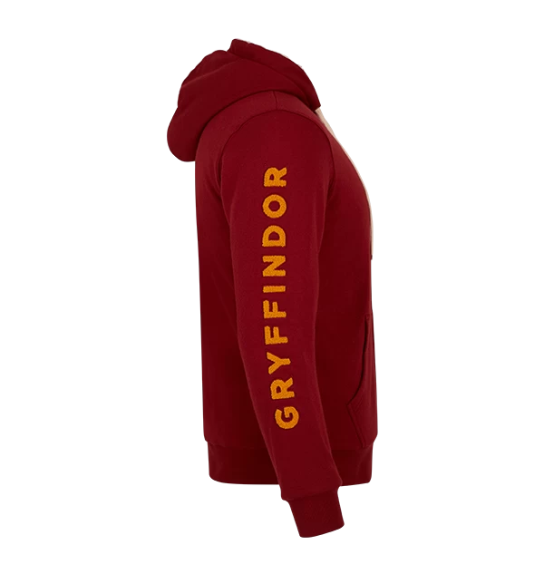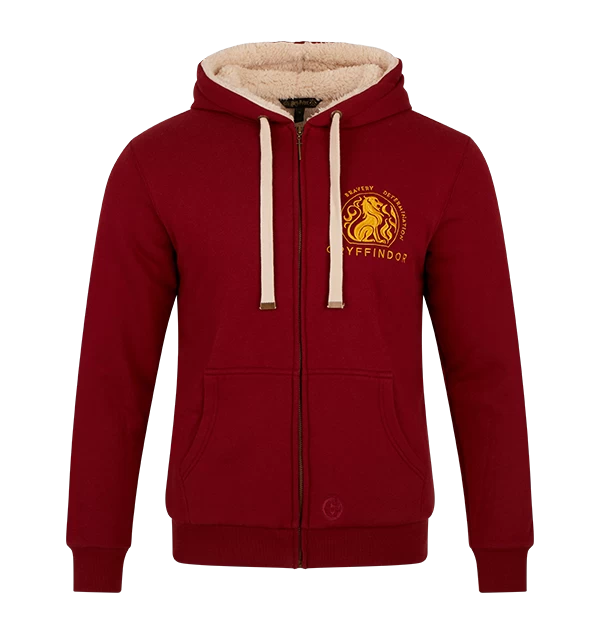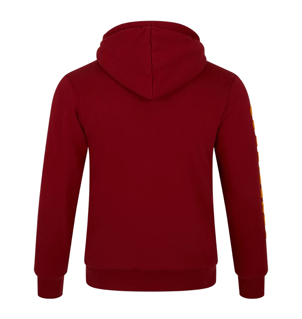 Refresh your wardrobe with this unisex Gryffindor fleece hoodie. The scarlet red hoodie features a yellow lion embroidered into the right-hand side of the chest. The hoodie is complete with the Gryffindor house motto ‘Courage’, ‘Bravery’ and ‘Determination’ printed in yellow.