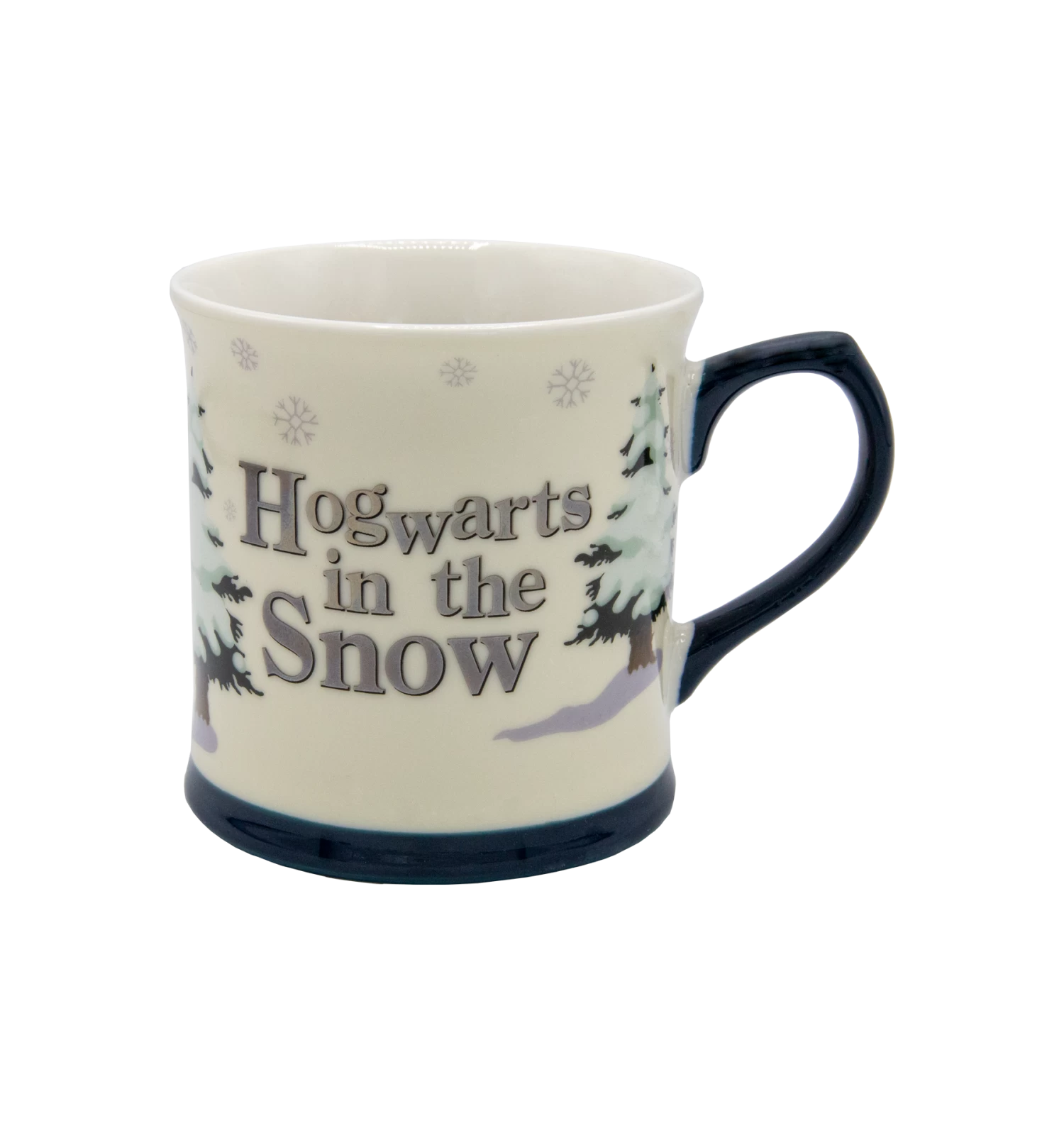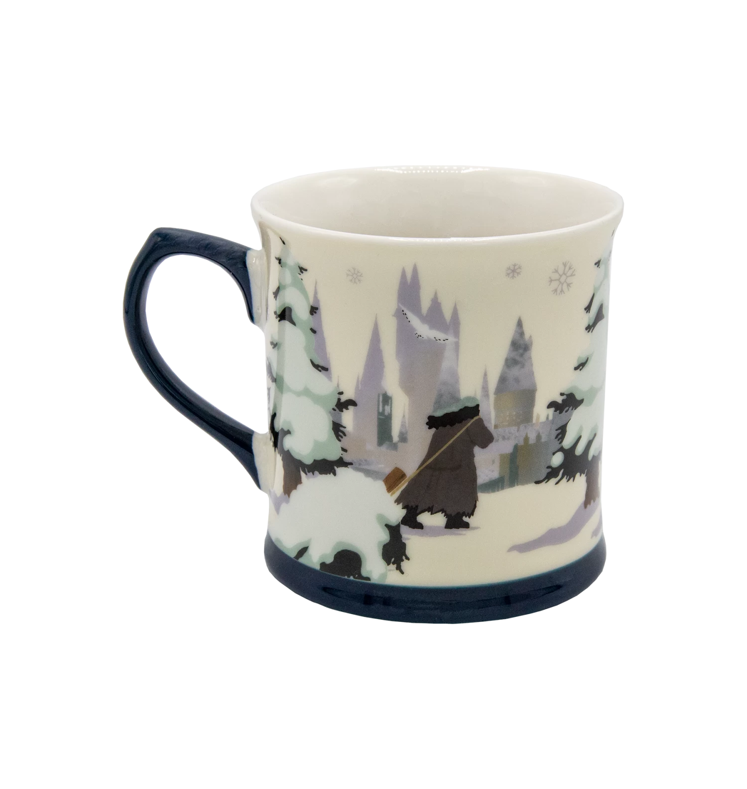 Made from white ceramic, this festive mug has a navy base and handle evocative of a frosty winter evening. It accompanies a delightful illustrated design of Hagrid pulling a snow capped fir tree towards Hogwarts Castle. The reflective silver metallic font reads “Hogwarts in the Snow” on the opposite side, surrounded by softly drifting snowflakes.