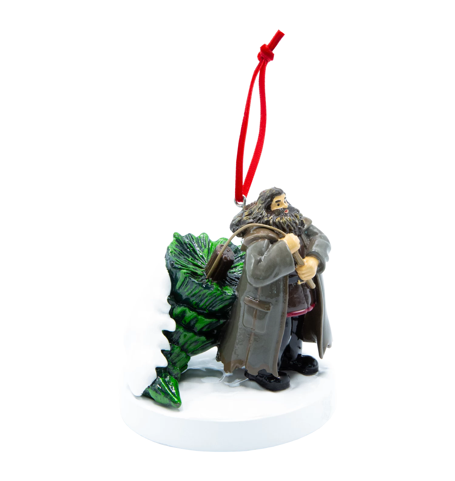 Relive the iconic holiday moment from the film as Hagrid guides a freshly cut Christmas tree from the snowy castle grounds towards Hogwarts. The attached red velvet hanging loop can be used to grace your tree, mantle, or any space in need of a festive touch with this cheerful work of art.