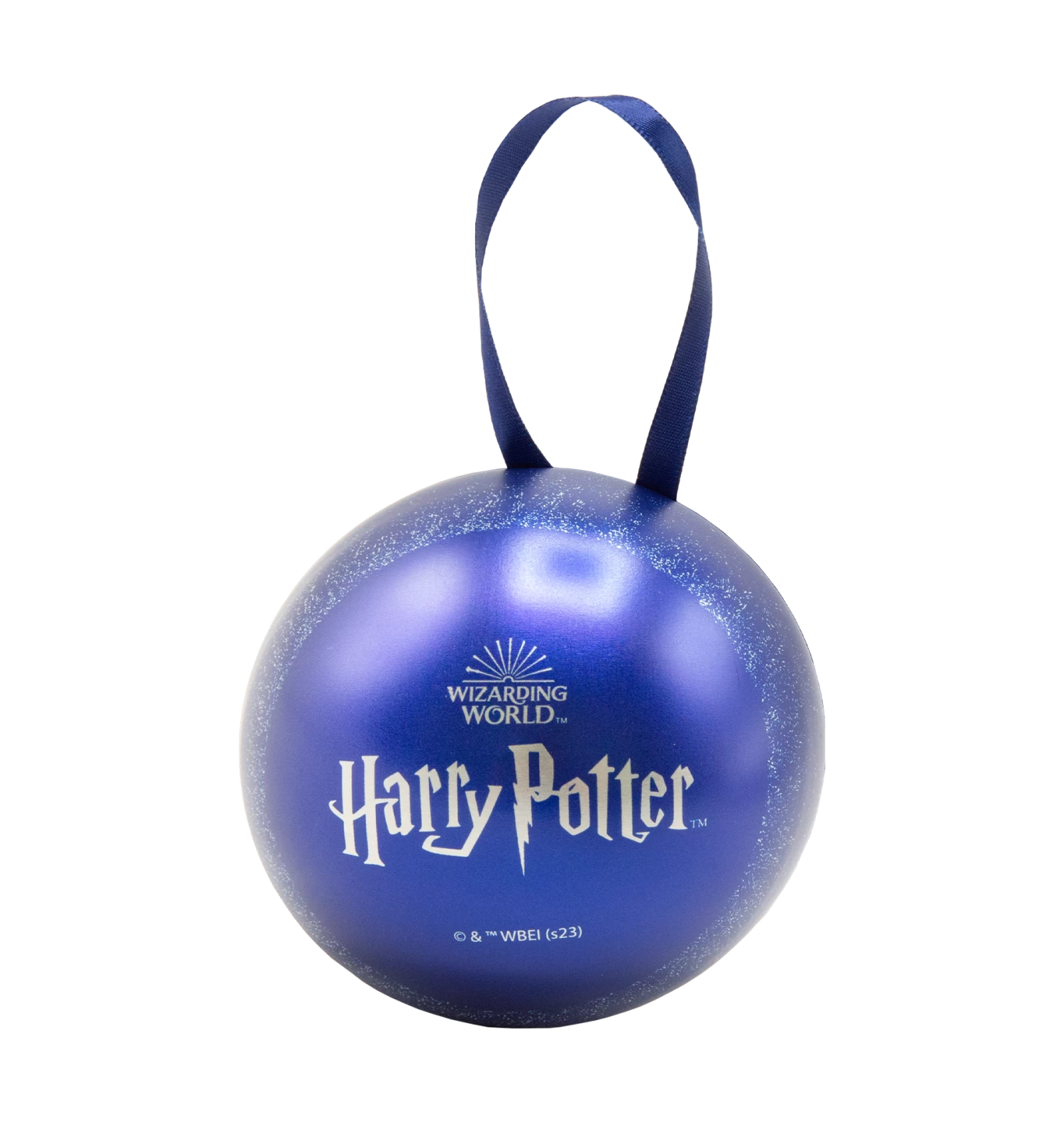 Crafted in a satin metallic navy tinplate, this decoration measures 8cm in diameter and features an iconic Christmas scene from the Philosopher’s Stone. Hagrid pulls a freshly cut fir tree through the snow outside Hogwarts Castle. Stars, candles, and snowflakes surround the illustrative design while a scrolling white banner reads “Hogwarts in the Snow.” Silver accents and glitter dust the edges, with the reverse side showcasing the Wizarding World logo and classic Harry Potter font.