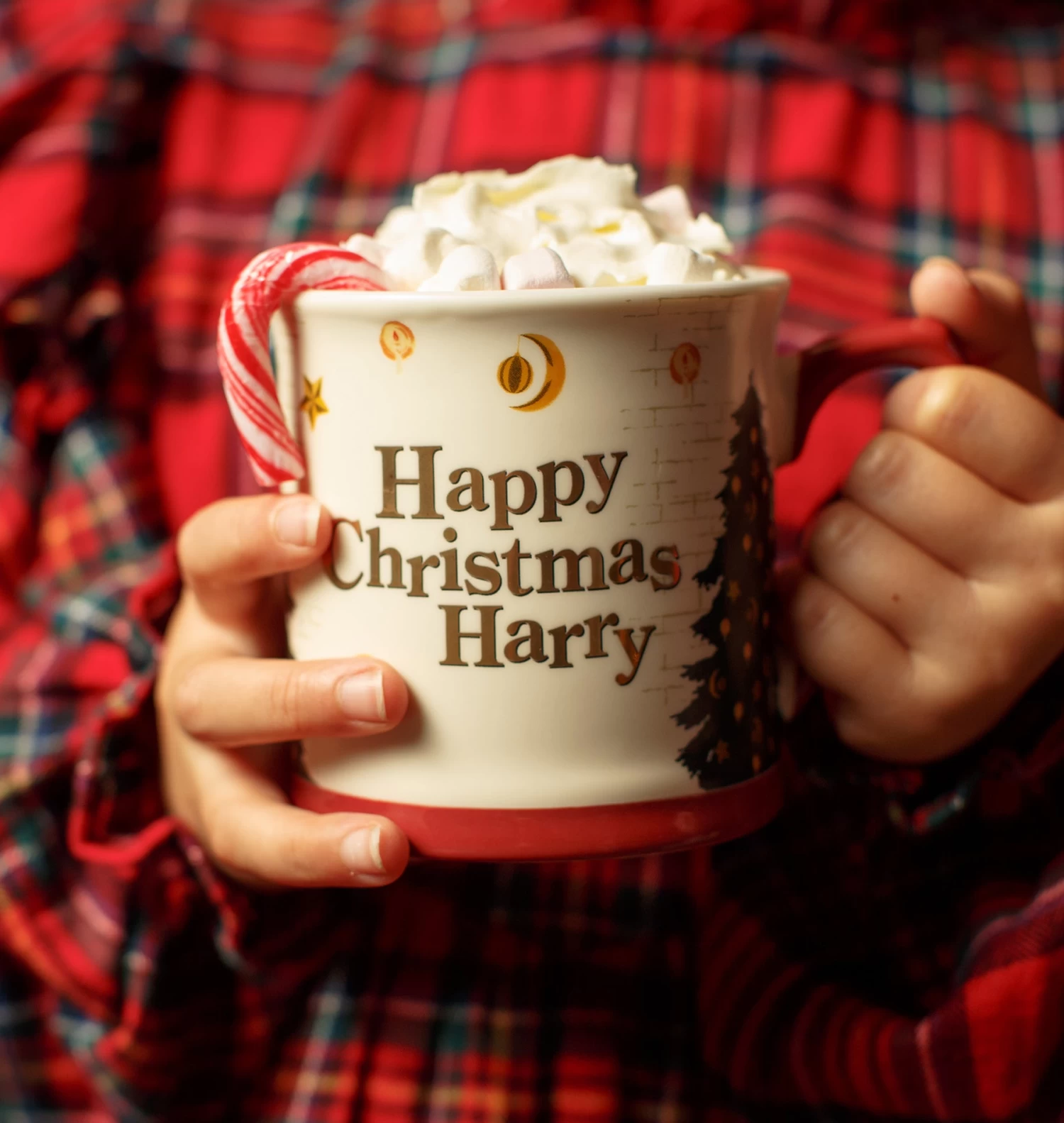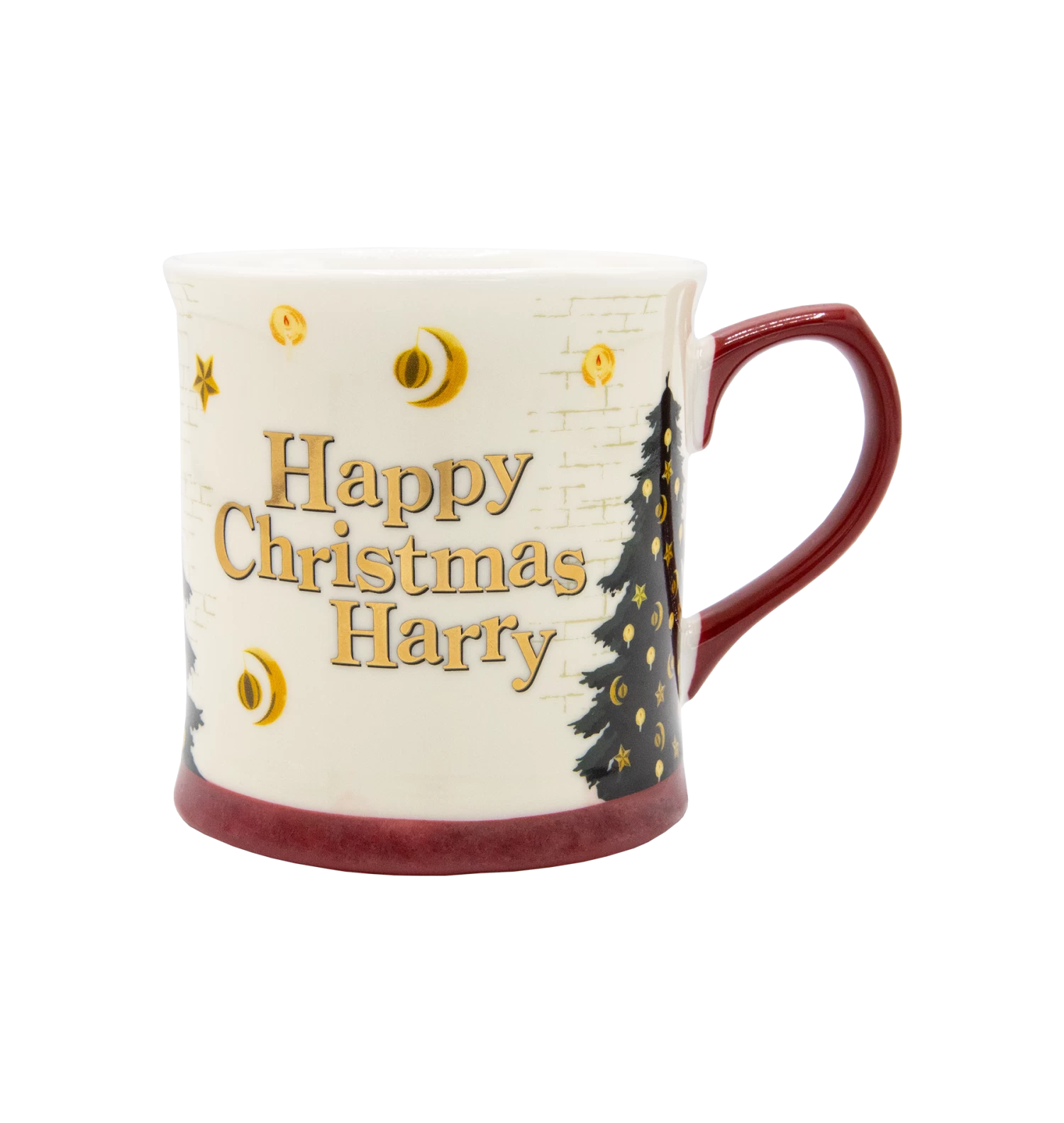 Made from white ceramic, this festive mug has a deep red base and handle. It accompanies a delightful illustrated design of Harry sitting in front of a Christmas tree in Hogwarts Great Hall. The reflective gold metallic font reads “Happy Christmas Harry” on the opposite side; a quote Ron Weasley makes to Harry in the iconic film scene.