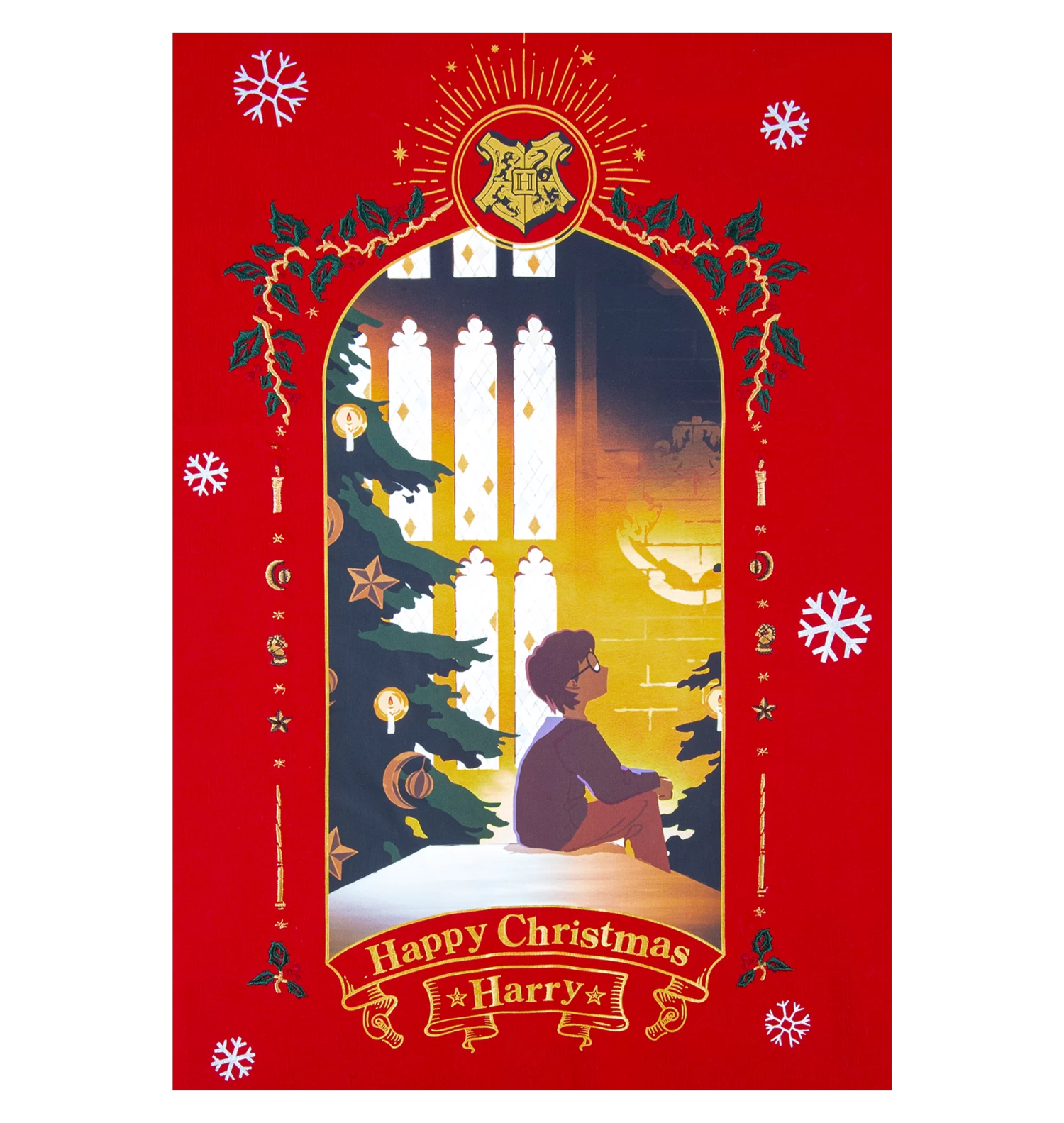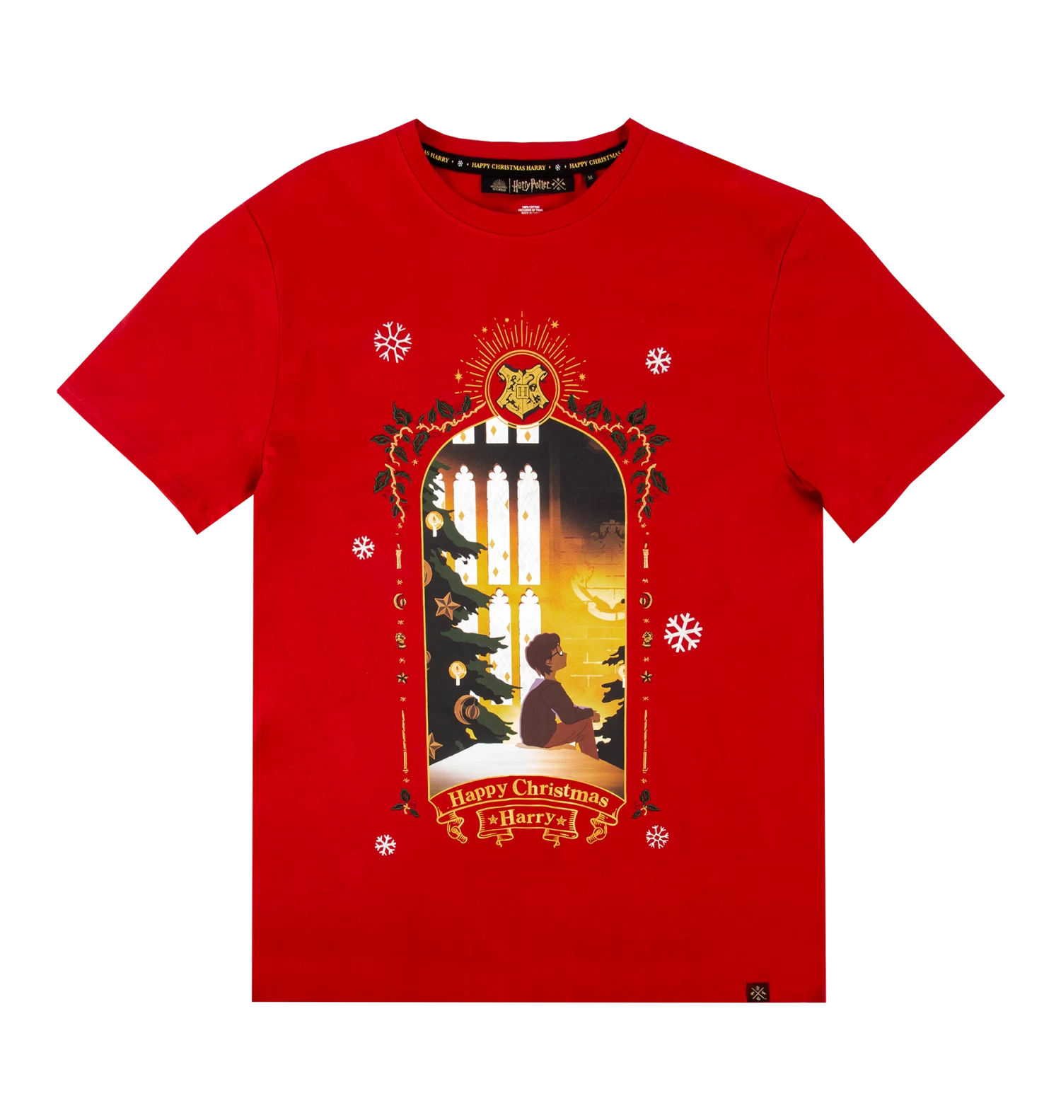 This holiday season, add a touch of enchantment to your look with the Harry Christmas T-Shirt. This bright red festive garment features the iconic magical moment from the Philosopher’s Stone where Harry sits in the Great Hall of Hogwarts, in front of a beautifully decorated Christmas tree.