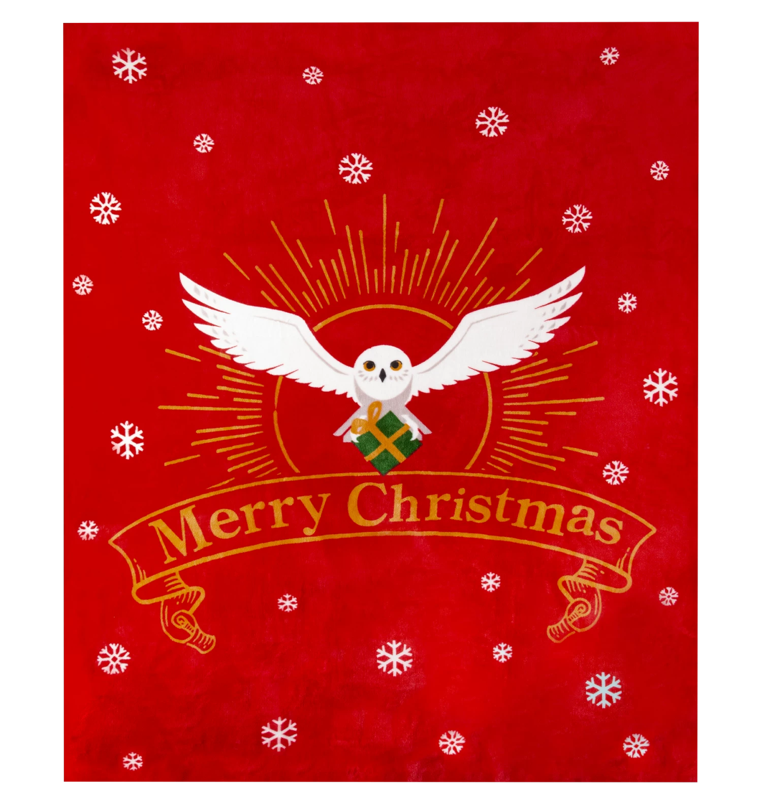 Wrap yourself up in this luxuriously soft Hedwig Christmas blanket, and feel the festive warmth! Measuring at 127cm x 152cm its plush, velvety red exterior is elegantly contrasted by deluxe white Sherpa fleece lining that will keep you feeling toasty. The graphic artwork showcases Hedwig in flight, majestically clutching a present amidst snowflakes and a golden halo, while a scrolled banner wishes you “Merry Christmas.”