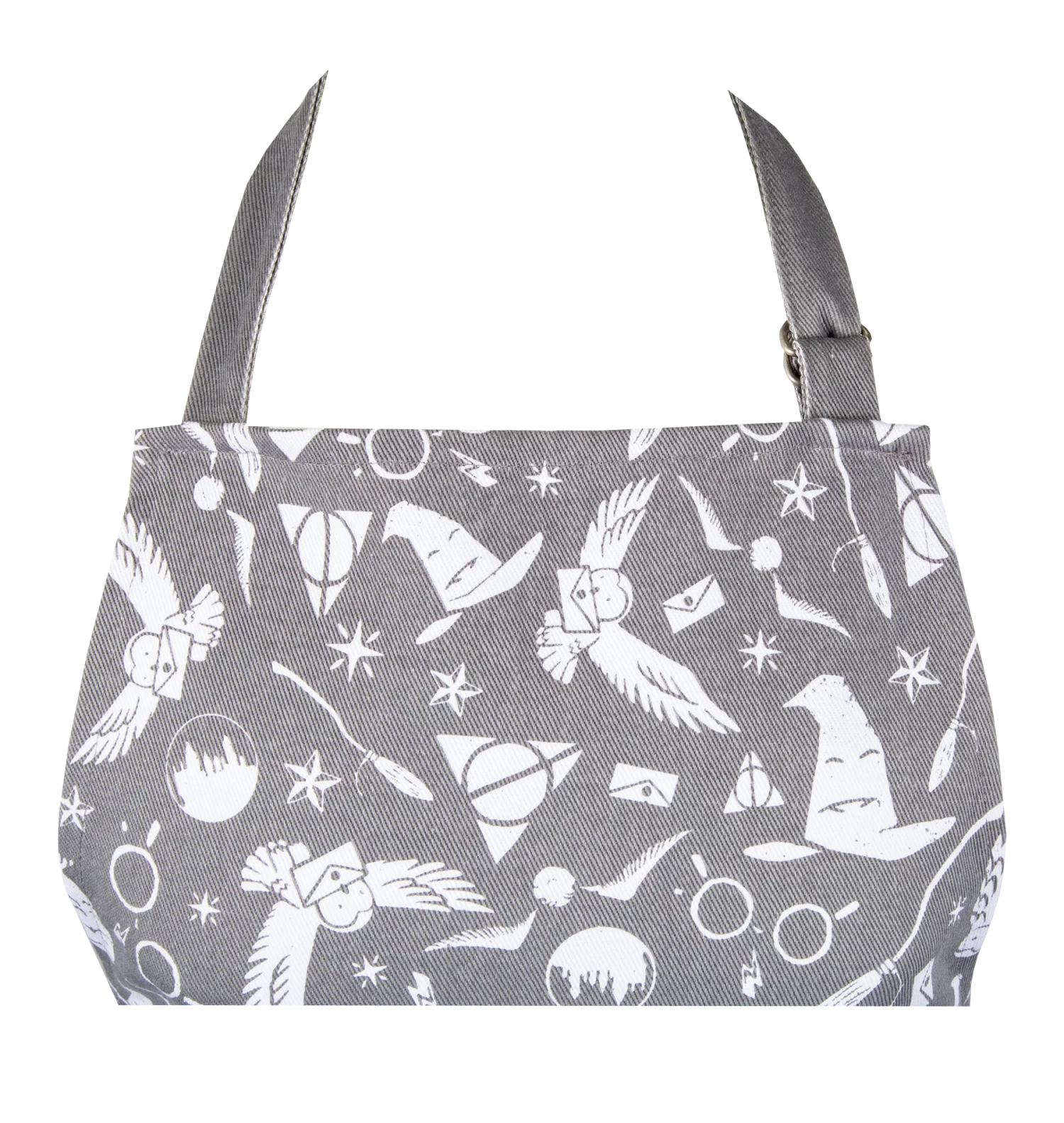 Be enthralled by a whimsical illustrative pattern including everything from the Golden Snitch, Sorting Hat, the Deathly Hallows, Acceptance Letters and more! The iconic imagery is distinctly Harry Potter and printed in distressed white on a stone grey base.Â