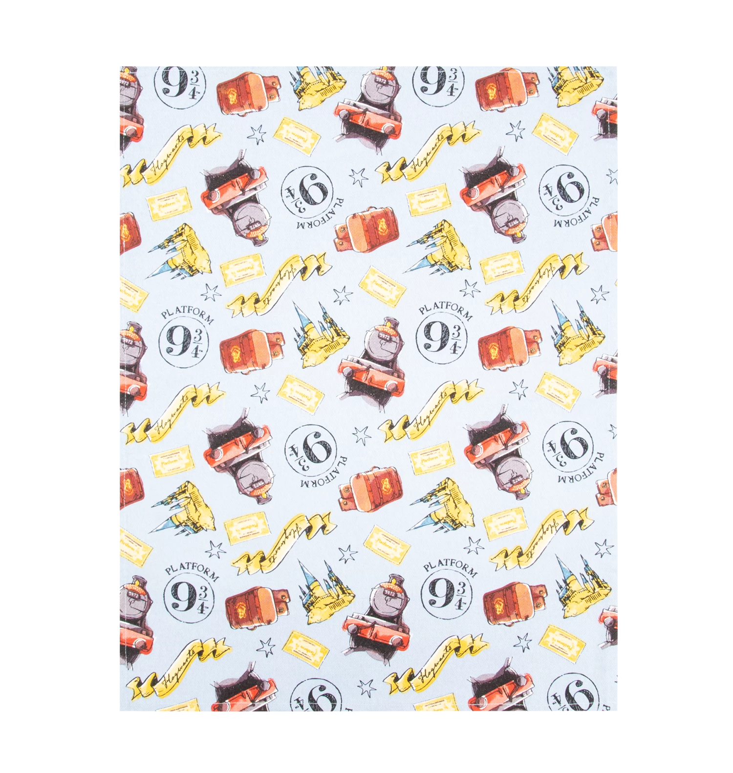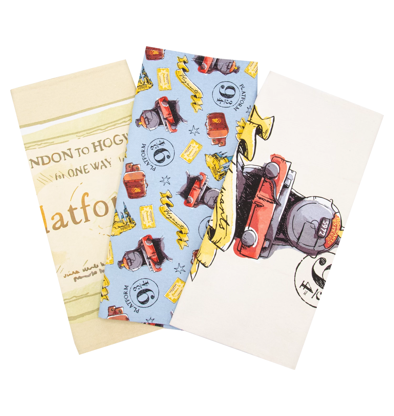The set includes three distinct designs. The first towel showcases a large illustration of the iconic Hogwarts Express, capturing the essence of the iconic steam engine. The second towel features a whimsical Hogwarts Express ticket design, while the third is covered in all-over print, showcasing the magical elements associated with the iconic platform on a delightful baby blue backdrop.