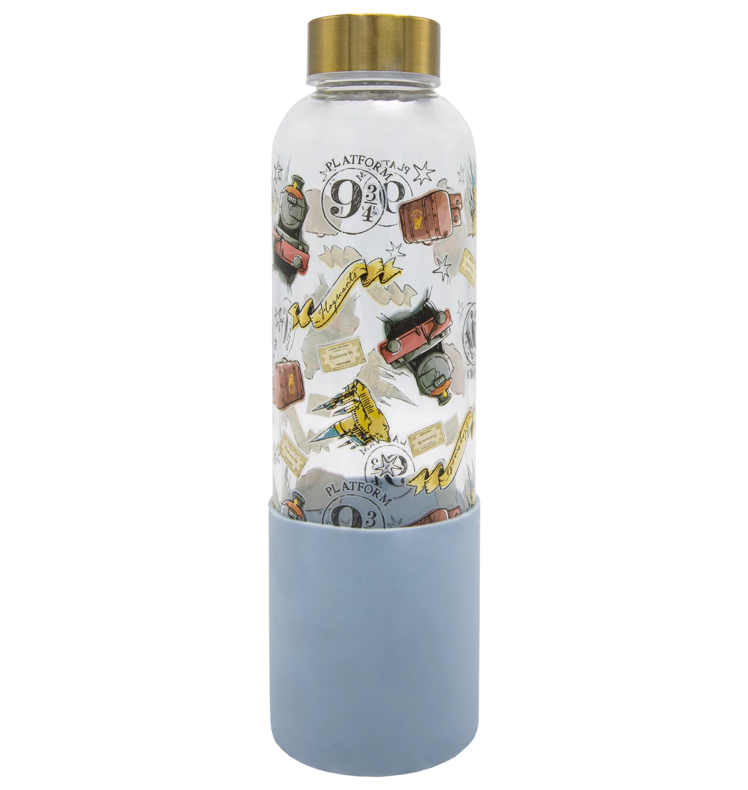 Crafted from durable borosilicate glass with a reliable silicone base, the bottle combines style and functionality. The glass construction ensures the purity of your beverages, while the silicone base provides stability and safeguards against accidental bumps. An embossed Platform 9 3/4 sign can be found on the top of the metallic gold twist cap.