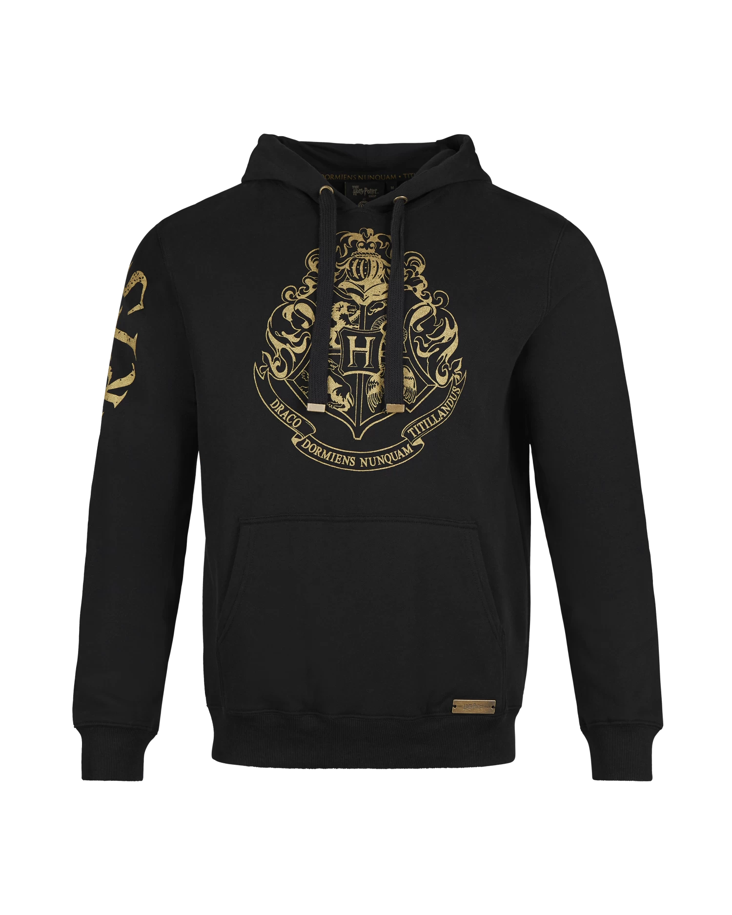 Celebrate the wizarding world with this stylish Hogwarts crest hoodie featuring the iconic Hogwarts crest in a gold, metallic print alongside Hogwarts printed down the right-hand sleeve. It also includes a full tunnel pocket in front to hide away any trinkets, or just to keep hands warm in the cooler months. The hoodie has a fitted hood and two strings which are adjustable for a suitable and comfortable fit.