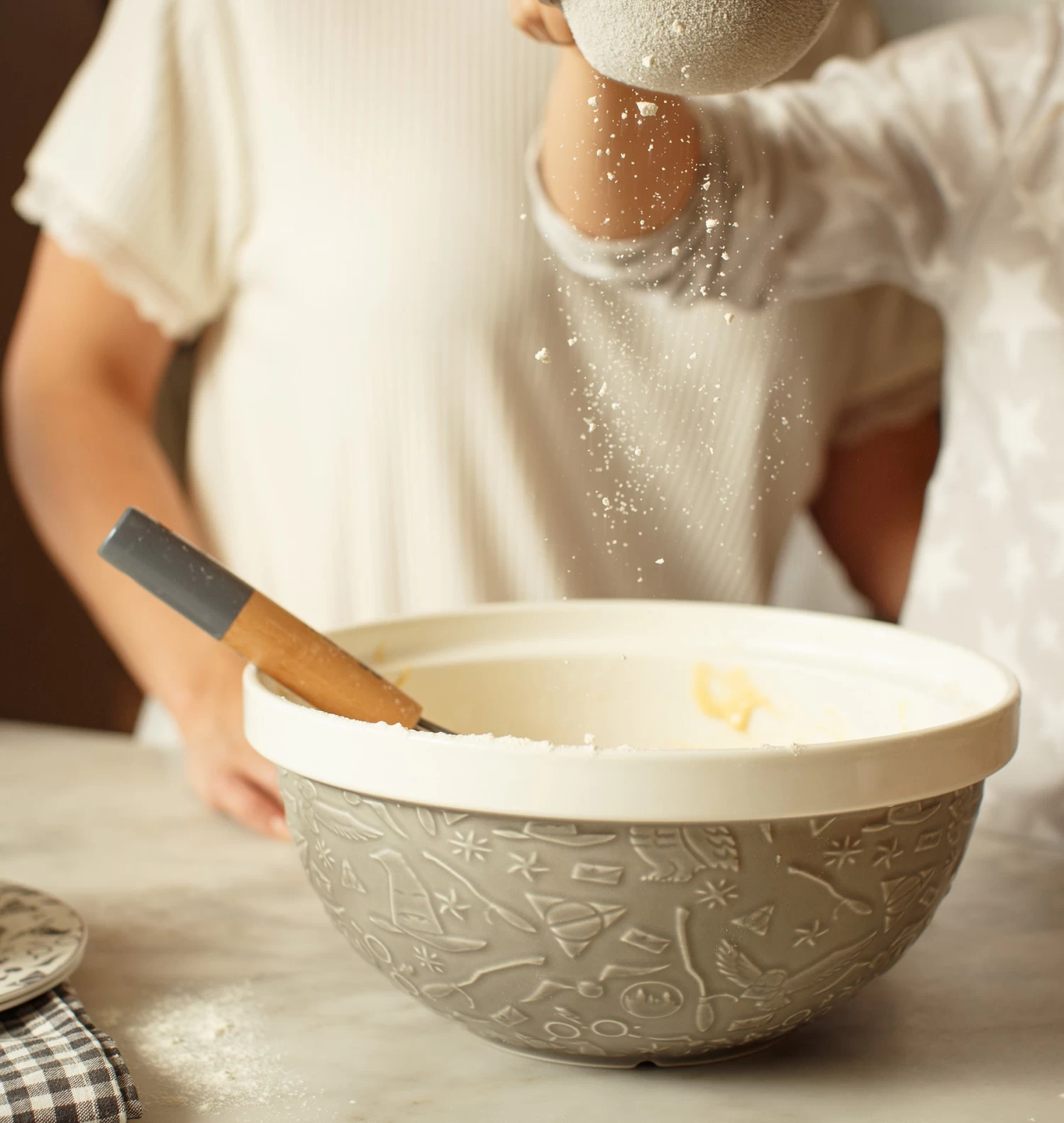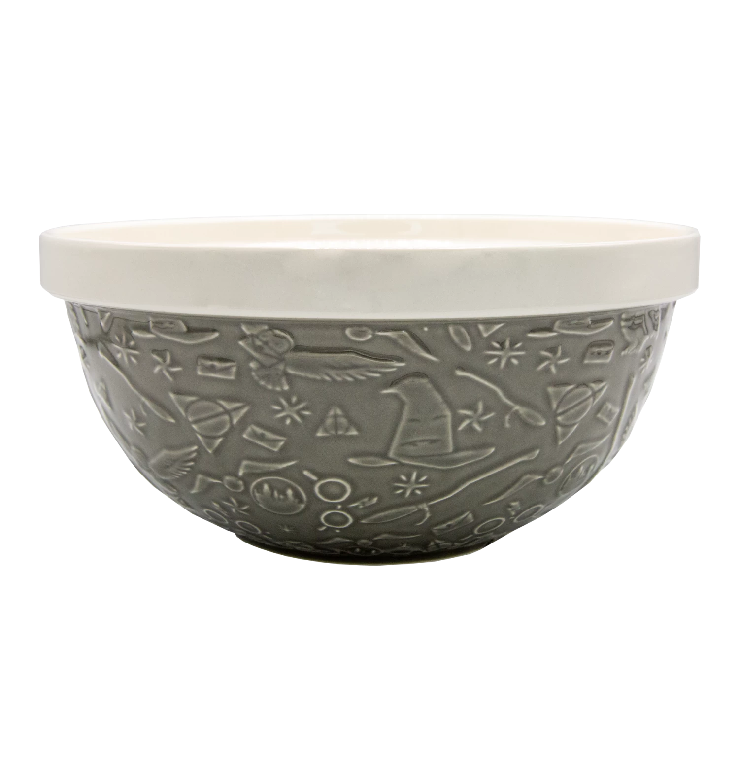 This quality Hogwarts Mixing Bowl boasts a solid light grey rim and a raised pattern showcasing iconic Harry Potter characters, symbols, and imagery. From the wise Sorting Hat to the faithful Hedwig, broomsticks, stars, and Harry’s glasses, every detail adorns its stone-like surface.