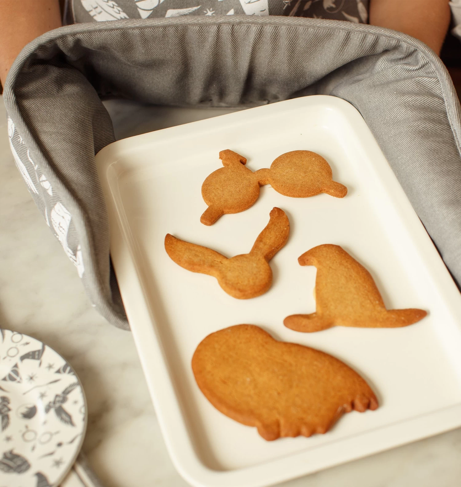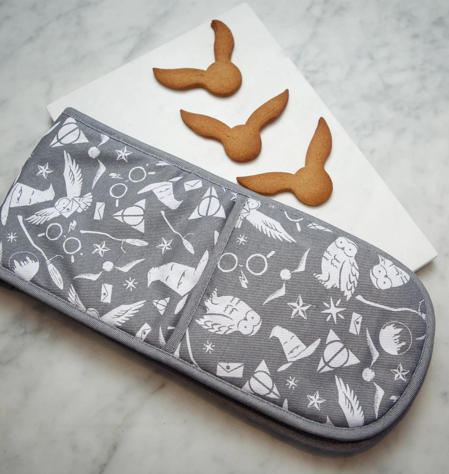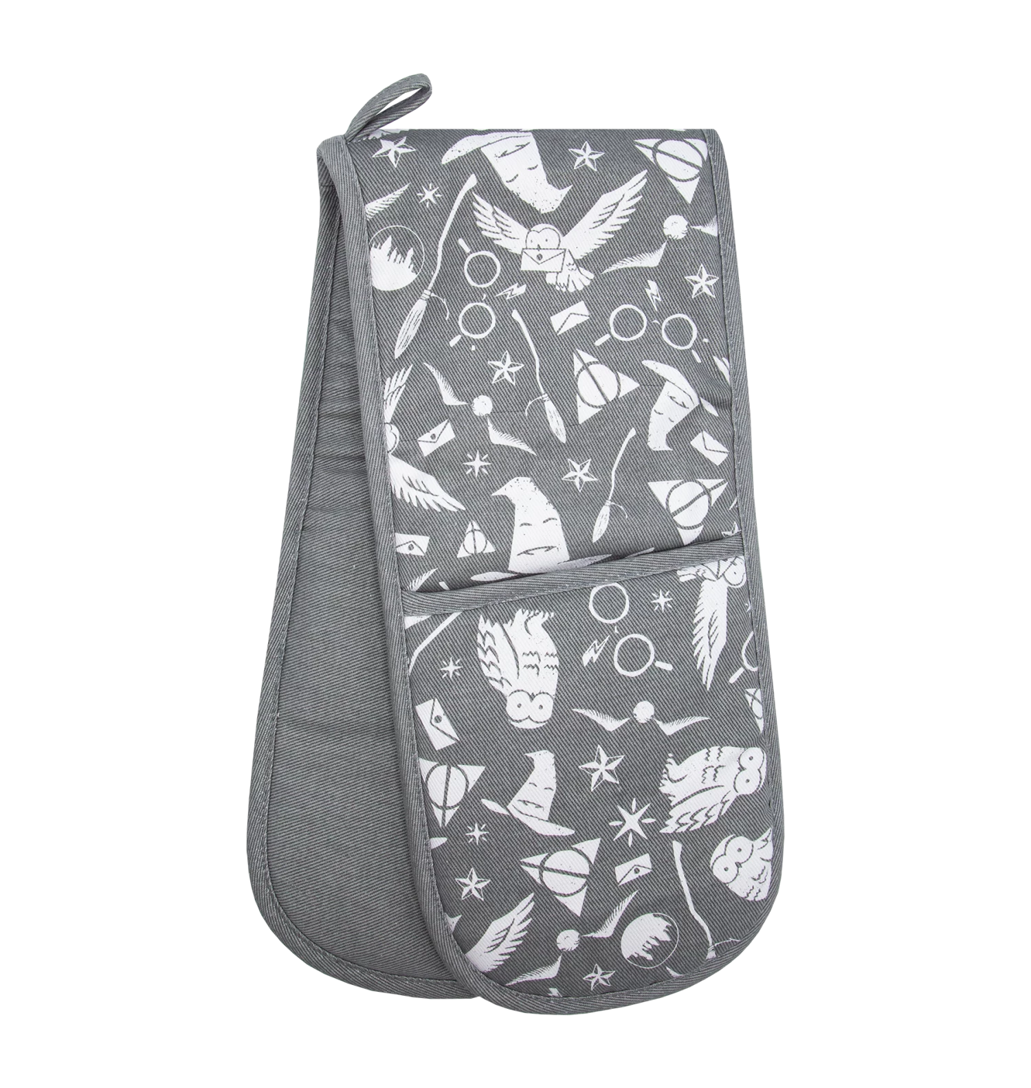 Experience the magic of Harry Potter as you conjure your next culinary masterpiece with these Hogwarts Oven Gloves! Crafted in cosy, earth tone, grey and iconic imagery, these gloves will transport you straight to Hogwarts hearthstone kitchens. Find everything from Hedwig and the Sorting Hat to broomsticks, stars and Harry’s glasses printed throughout its exclusive graphic design.