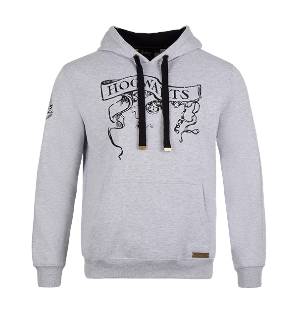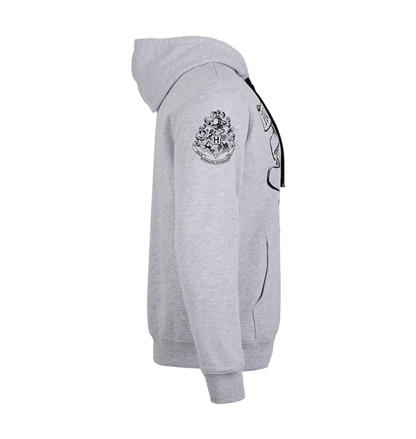 Wizardry school pride is made easy with this statement Hogwarts scroll jumper. This hoodie features the celebrated and iconic Hogwarts crest in a black design alongside a scroll complete with ‘Hogwarts’ written on it. The light grey hoodie includes a full tunnel pocket in front to hide away your trinkets, or just to keep hands warm in the cooler months. The hoodie has a fitted hood with a black interior and two black strings which are adjustable for a suitable and comfortable fit.