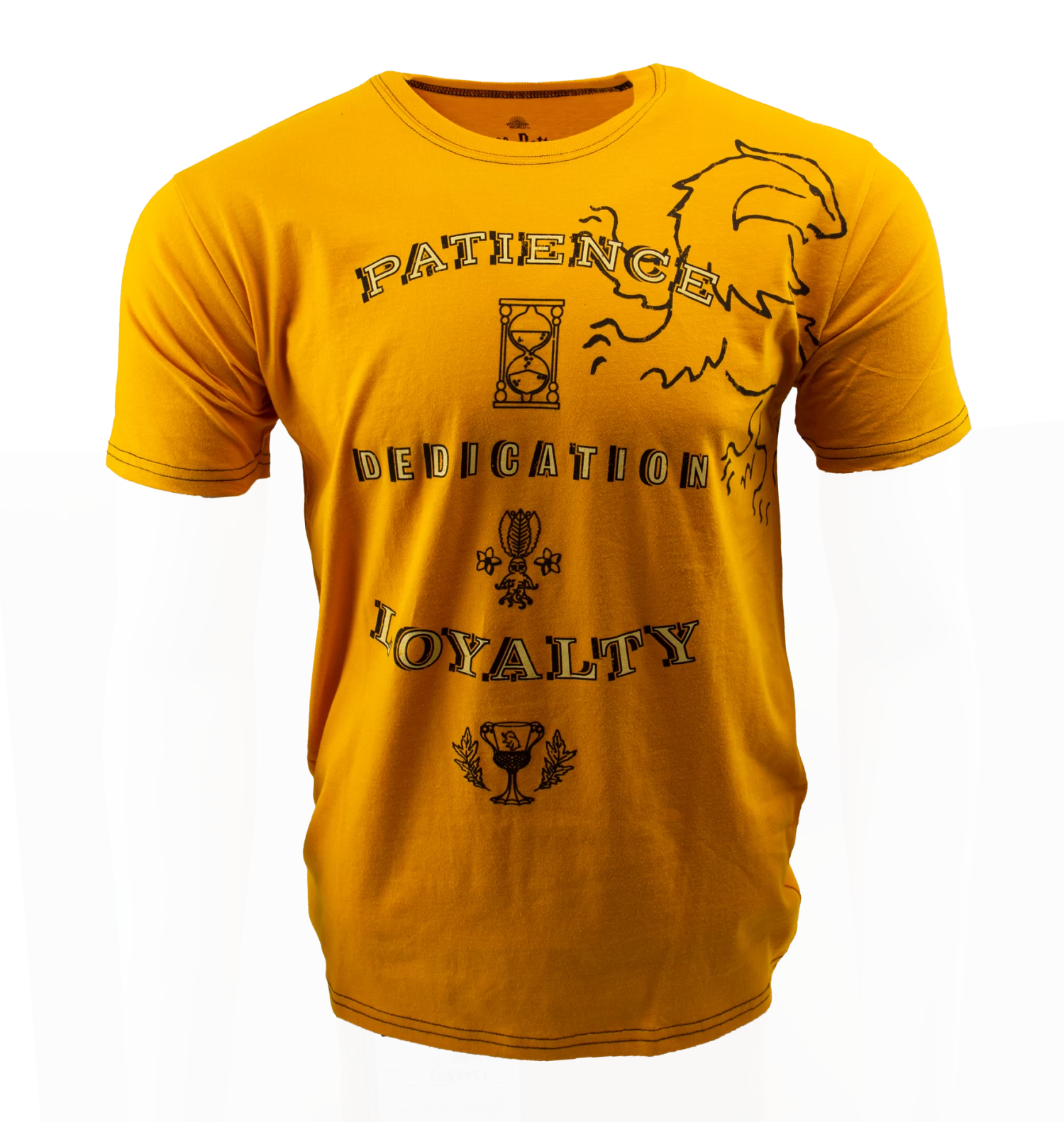 This Hufflepuff Attribute T-Shirt is covered in various Hufflepuff symbolism, proudly displaying the three most prominent traits associated with the house: Patience, Dedication and Loyalty in bold, distressed fonts. A large screen print design of Hufflepuffâs iconic house mascot is featured across the left chest.
