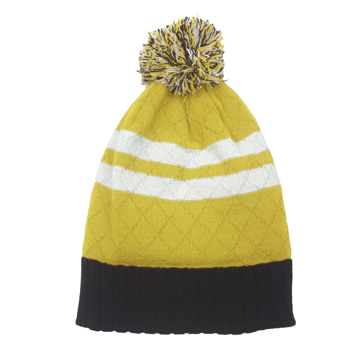Show off your house pride and keep warm with this Hufflepuff bobble hat. The hat comes in a honey yellow, the traditional colour of Hufflepuff house and features two white stripes.