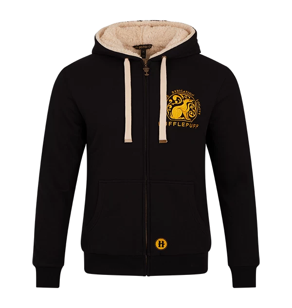 Refresh your wardrobe with this unisex Hufflepuff fleece hoodie. The black hoodie features a yellow badger embroidered into the right-hand side of the chest. The hoodie is complete with the Hufflepuff house motto ‘Patience’, ‘Dedication’ and Loyalty’ printed in yellow.