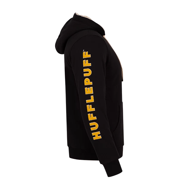 The house name is screen-printed along the sleeve in a yellow font. The interior of the hoodie is lined with thick winter white, soft Sherpa fleece, making it the perfect addition to your wardrobe in colder months. The hoodie also includes a tunnel pocket in front, and two cream-coloured strings which can be adjusted for a suitable and comfortable fit.