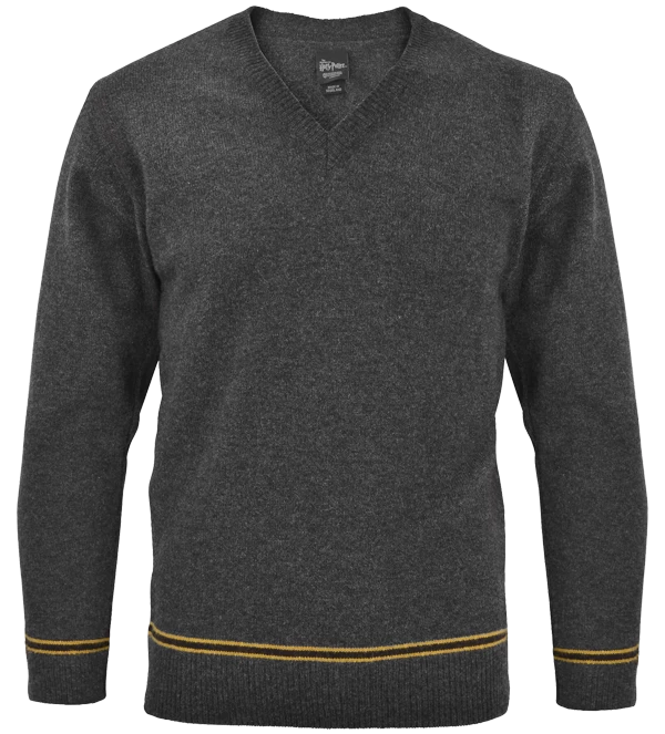 This charcoal V-neck Hufflepuff sweater is knitted and assembled in the Scottish Mill that made the costumes for the cast and extras in the Harry Potter film series.
