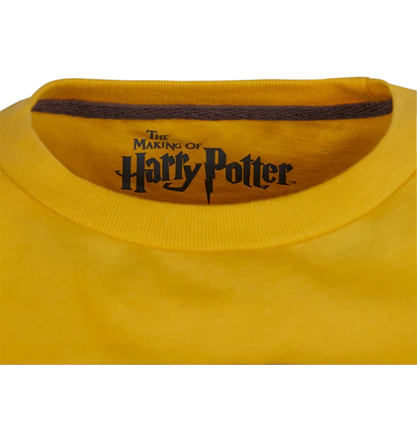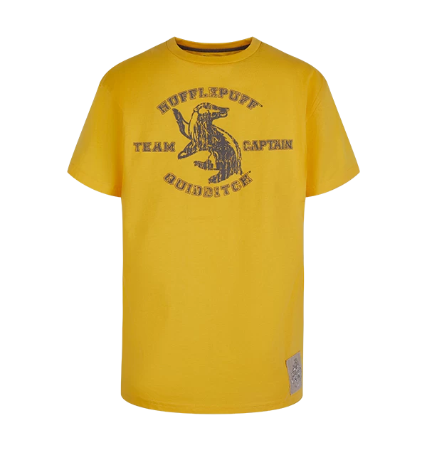 Join the Hufflepuff Quidditch team with this Kids Hufflepuff Quidditch Team Captain t-shirt. The t-shirt is a bright yellow colour, the traditional colour of the Hufflepuff house, and features a raised flock print design across the chest in grey of the Hufflepuff house animal, a badger.