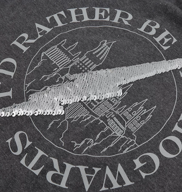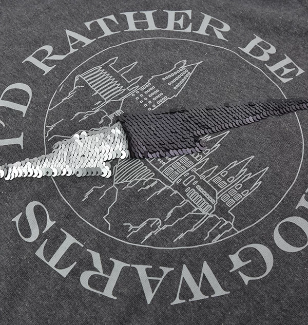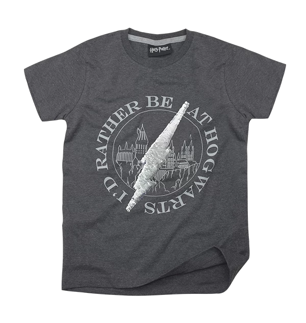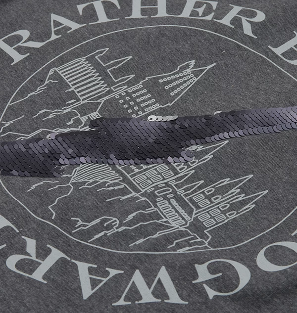 This stunning dark grey shirt has a centre image of Hogwarts Castle, surrounded by the slogan “I’d rather be at Hogwarts”. Across the image of the castle, you can find a sequin lightning bolt. This embellishment is reversible; if you brush the sequins in one direction, the lightning bolt becomes silver. If you brush in the other direction, they become black.
