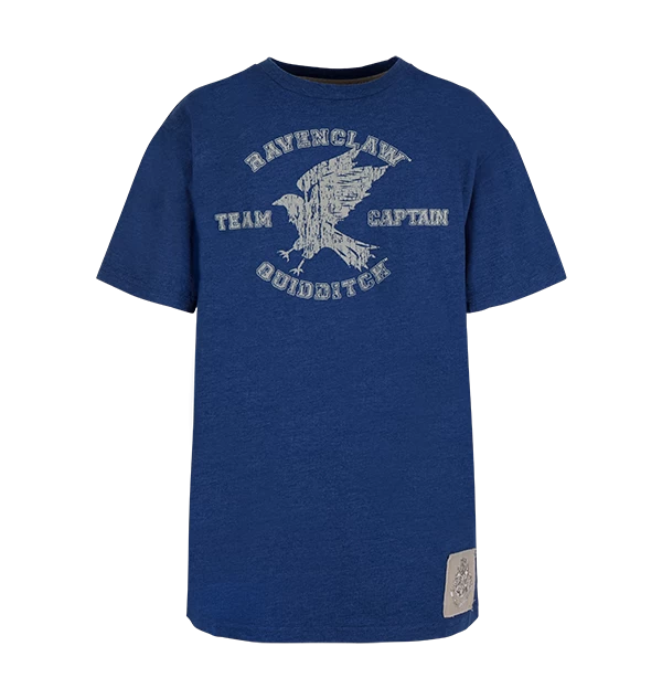 Join the Ravenclaw Quidditch team with this Kids Ravenclaw Quidditch Team Captain t-shirt. The t-shirt is a blue colour, the traditional colour of the Ravenclaw house, and features a raised flock print design across the chest in grey of the Ravenclaw house animal, an eagle.