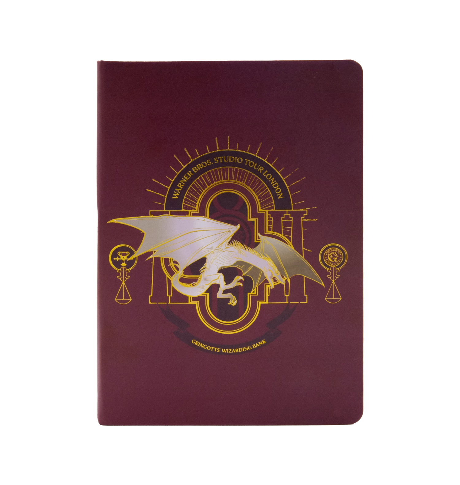 The exclusive London Iconic Gringotts collection celebrates the unique destination features of the Warner Bros. Studio Tour with this bespoke notebook. On a striking crimson background, a stark white Ukrainian Ironbelly dragon can be seen flying over top a geometric design representing the dramatic break-out from Gringotts Bank vault.