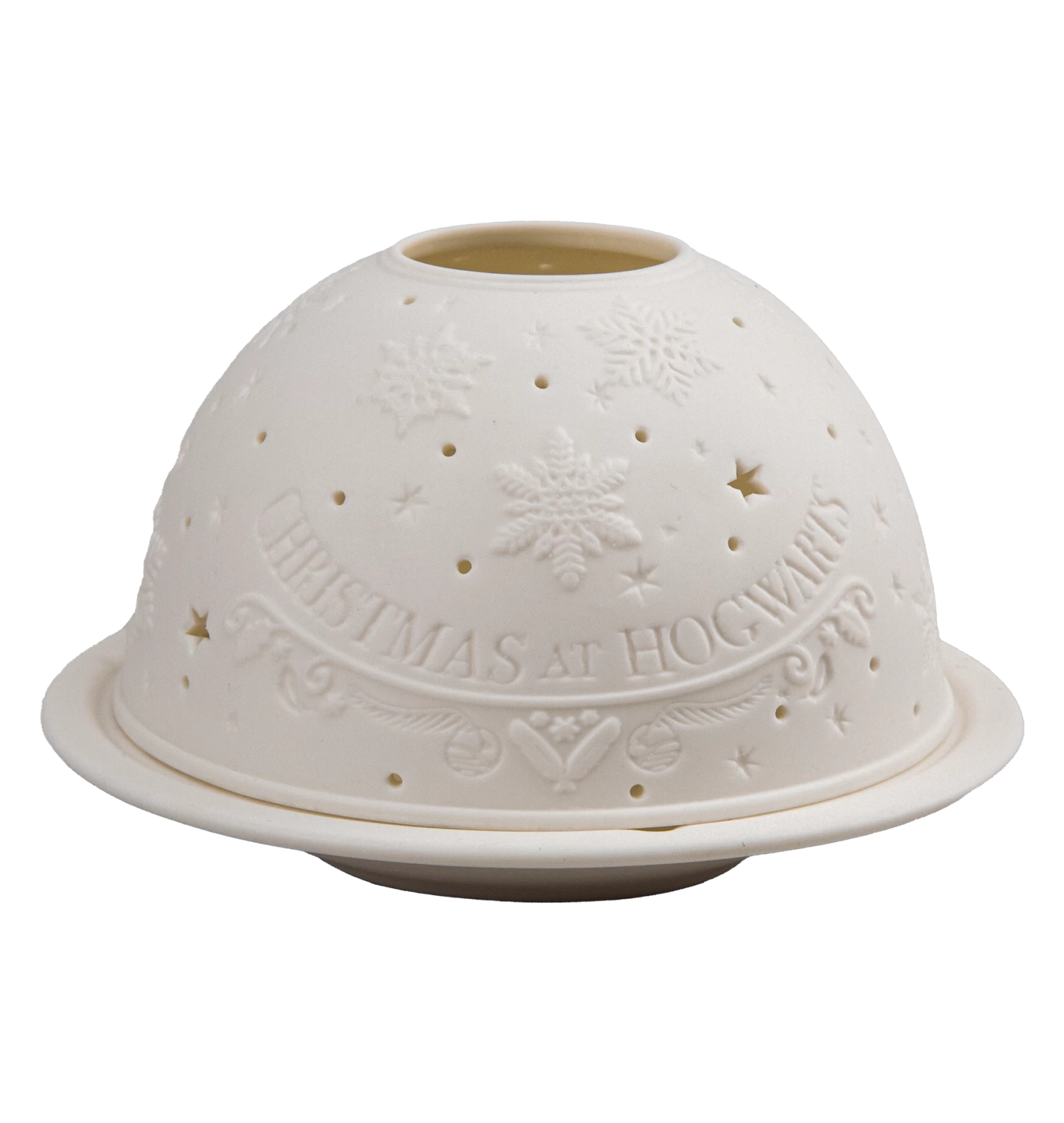 With a bone porcelain feel, this intricately detailed dome lifts to reveal a dish where the candle sits. When viewed in the light, snowflakes, evergreen pines, and a snowy owl surround a silhouette of a distant Hogwarts castle. But once the lights dim and a tealight is placed inside, the night sky lights up in a multitude of brilliant, flickering stars. The words ‘Christmas at Hogwarts’ can be seen in a scrolling recessed font.