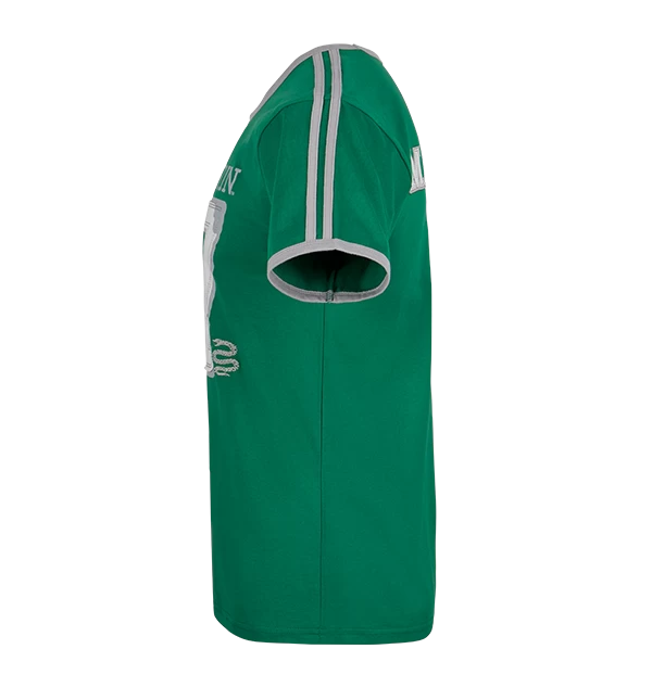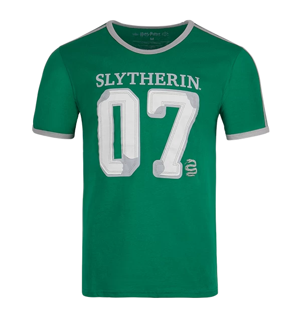 Celebrate your Hogwarts house loyalty with this bespoke Slytherin House Seeker T-Shirt. The short-sleeved t-shirt comes in the traditional house colour green which is combined with grey stripes along each sleeve. The number 07 is printed in a grey and white design in the centre of the t-shirt alongside the word Slytherin which is printed across the chest in grey. This personalised Slytherin t-shirt is complete with an embroidered grey serpent, the iconic Slytherin house animal.
