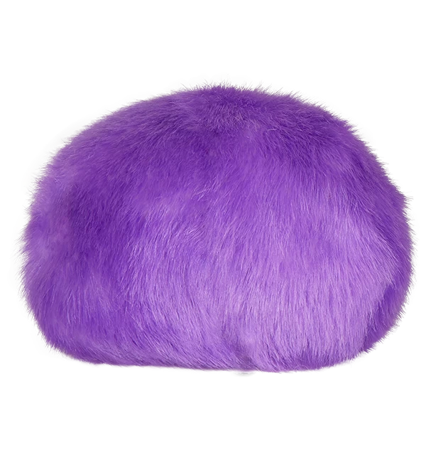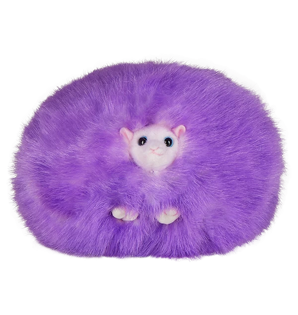 The Pygmy Puff plush with sound has fluffy, medium pile polyester fur in variegated shades of purple. Tiny white feet protrude from its fur and bright blue acrylic eyes stand out against its pale purple face.