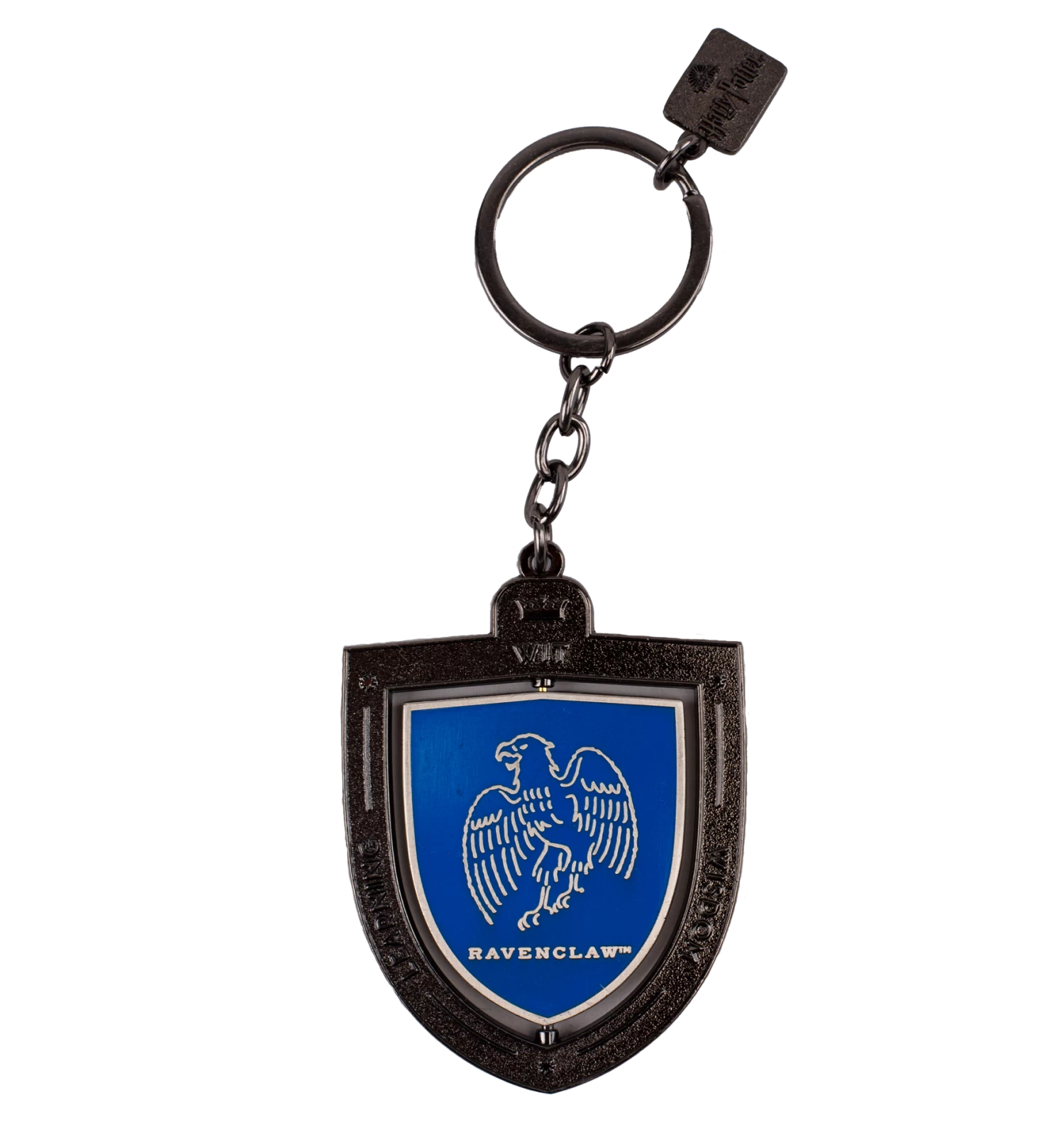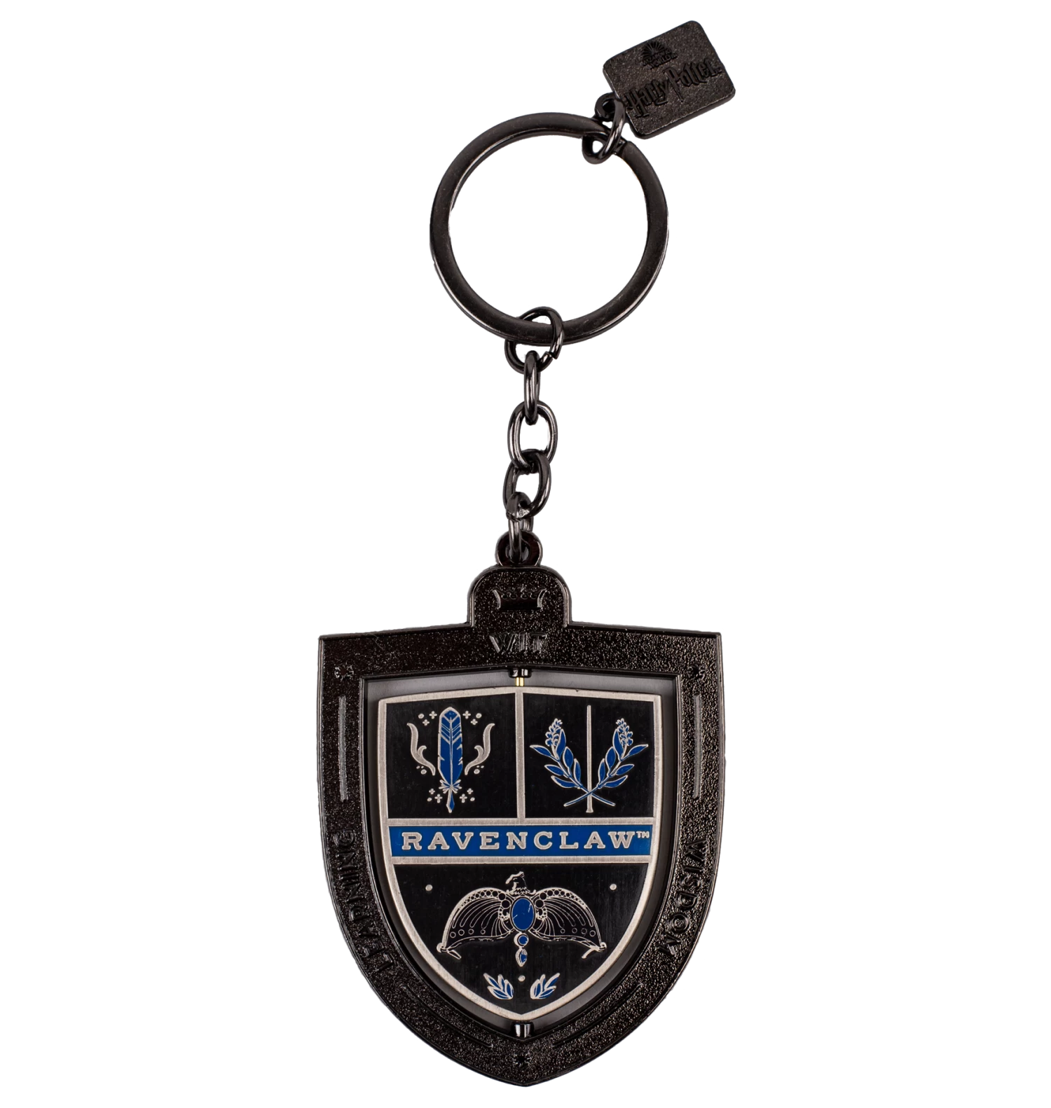 The blue center of this key ring is reminiscent of a heraldic crest on a shield, with the Ravenclaw eagle proudly featured in gold over top the house’s name. The steely grey frame to hold the middle spinner in place has embossed house traits along each edge, reading Wisdom Learning and Wit.