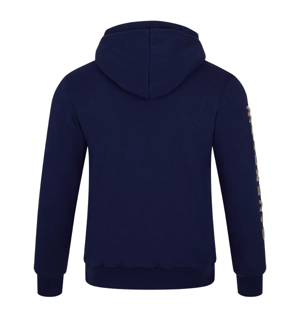 The house name is screen-printed along the sleeve in a light grey font. The interior of the hoodie is lined with thick winter white, soft Sherpa fleece, making it the perfect addition to your wardrobe in colder months. The hoodie also includes a tunnel pocket in front, and two cream-coloured strings which can be adjusted for a suitable and comfortable fit.