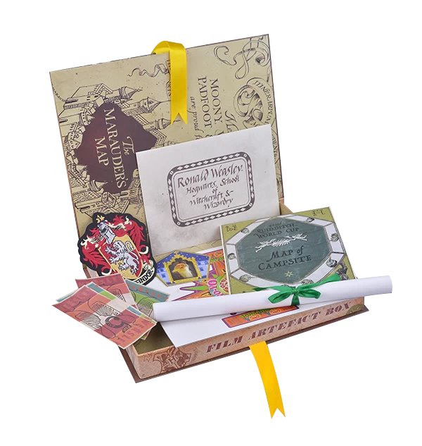 The Ron Weasley artefact box set includes a Gryffindor uniform embroidered crest, Quidditch World Cup map, a Howler, Dumbledore Card, Chudley Cannons Poster, a Weasley Betting Slip and Weasley Twins product package. Cardboard collector’s box measures approximately 21x28cm.