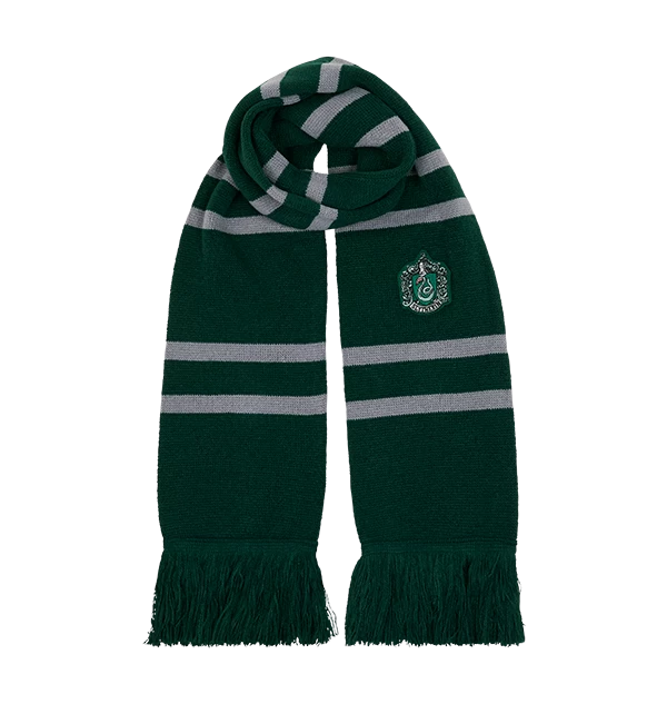 Keep warm in the cold and complete your House outfit with this magical knitted Slytherin scarf featuring the traditional colours of the Slytherin House in emerald green and silvery grey, this scarf is enchanted with leadership and ambition from the heart of the Slytherin House and the perfect accessory to add to your everyday look. Scarf measures 66 inches long and 7 inches in width.