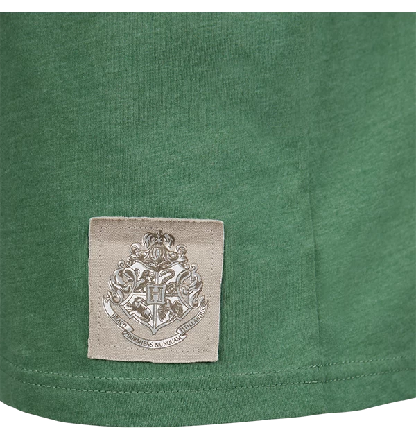 Join the Slytherin Quidditch team with this Slytherin Quidditch Team Captain t-shirt. The t-shirt is a green colour, the traditional colour of the Slytherin house, and features a raised flock print design across the chest in grey of the Slytherin house crest, a snake.