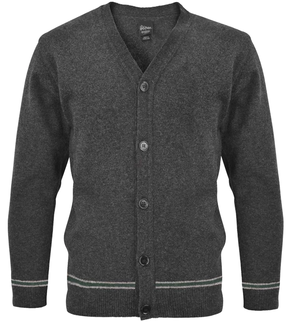 This charcoal V-neck Slytherin cardigan is knitted and assembled in the Scottish Mill that made the costumes for the cast and extras in the Harry Potter film series.