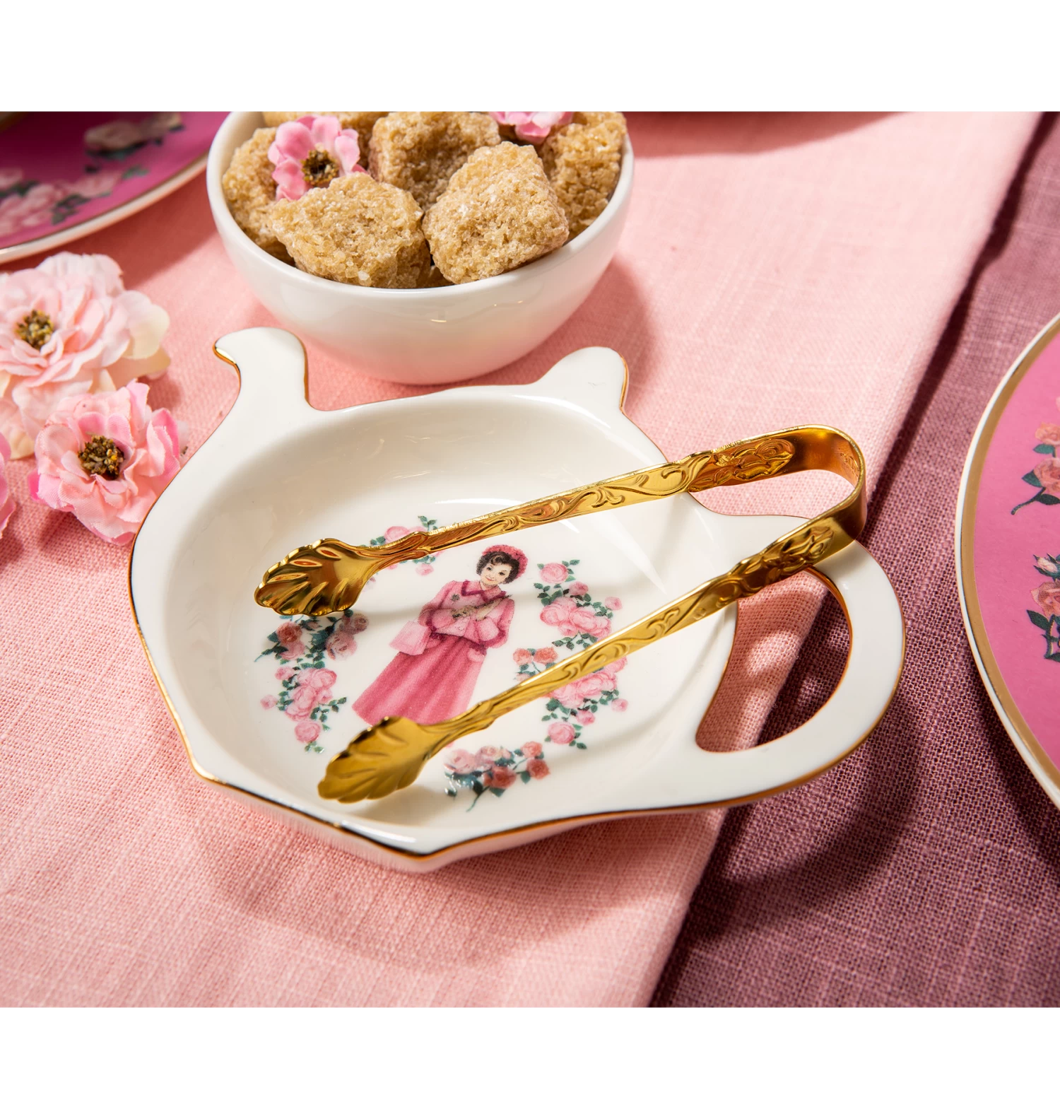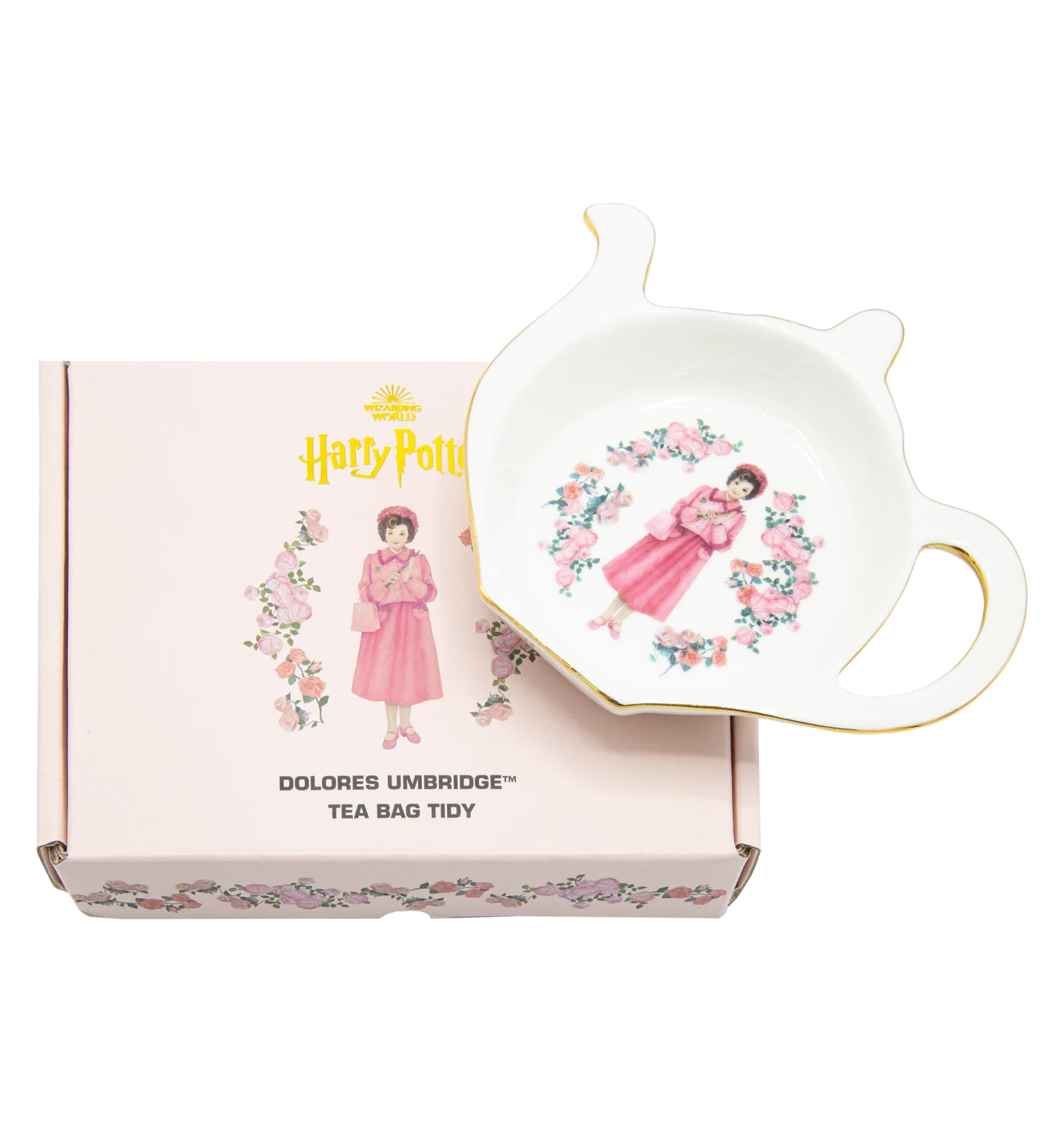 The magic is in the details, and nothing will compliment your tea party quite like the questionably traditional design of this Dolores Umbridge tea bag holder. Made from the finest new bone china, this tea tidy is shaped like a teapot and lined in gold, perfect for adding a touch of elegance to your table. The classic English pink rose pattern encircles an illustration of the infamous Professor Umbridge, holding her wand and dressed in her signature pink outfit from the movies.