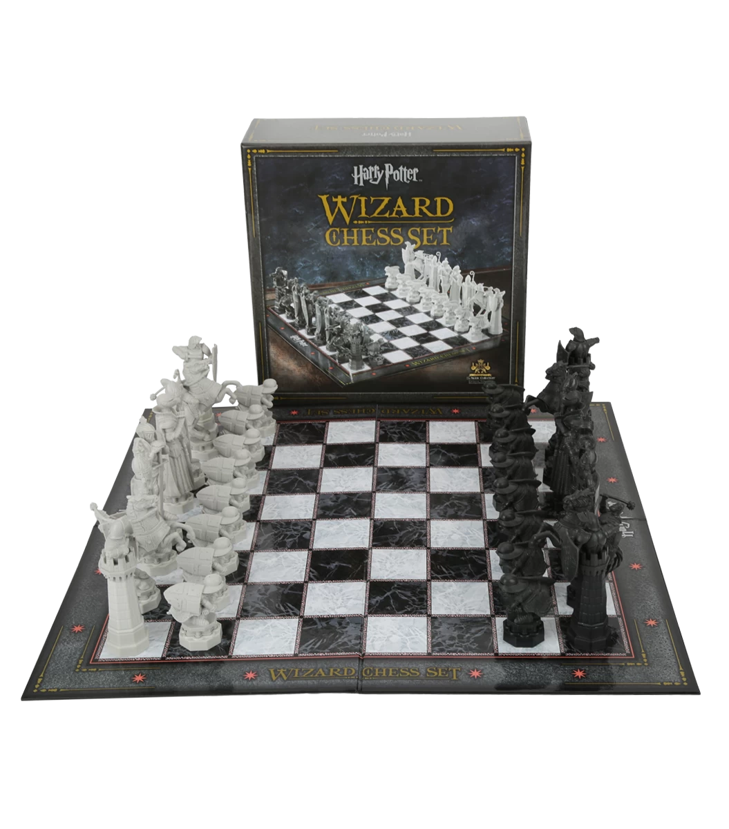 The Harry Potter Wizard Chess Set includes 32 moulded plastic chess pieces (each inspired by the grand statues seen in the film), and a folding playing board. Chess pieces measure between 5 to 10 cm, playing board measures 47cm square.