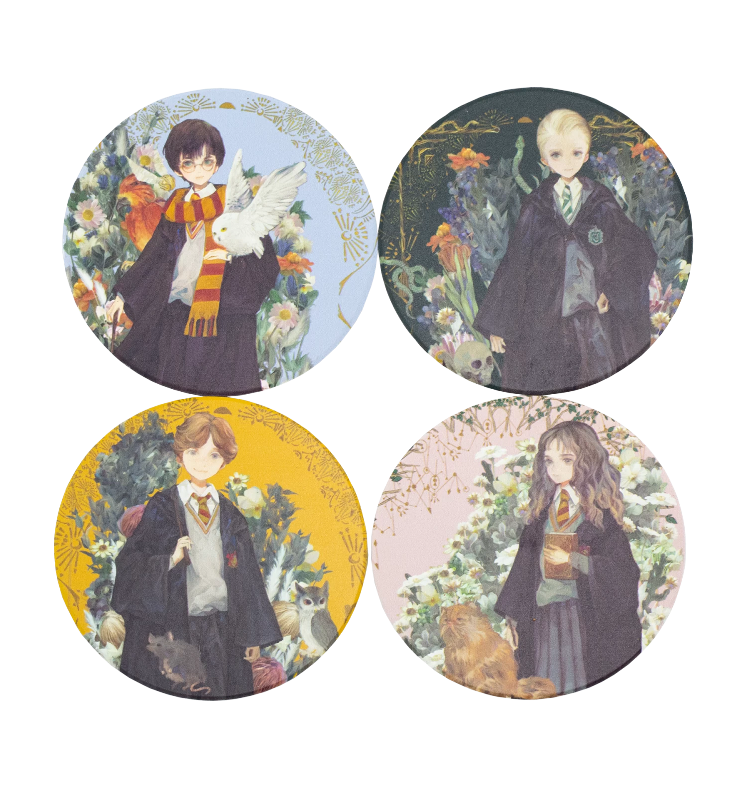 From Harry’s pastel blue coaster shared with Fawkes and Hedwig to Draco’s deep green coaster with mysterious twin serpents and skulls, each illustration tells a unique story. Ron’s fiery orange coaster is adorned with Scabbers and a brown owl, and Hermione’s pastel pink with Crookshanks and her prized magical textbook.