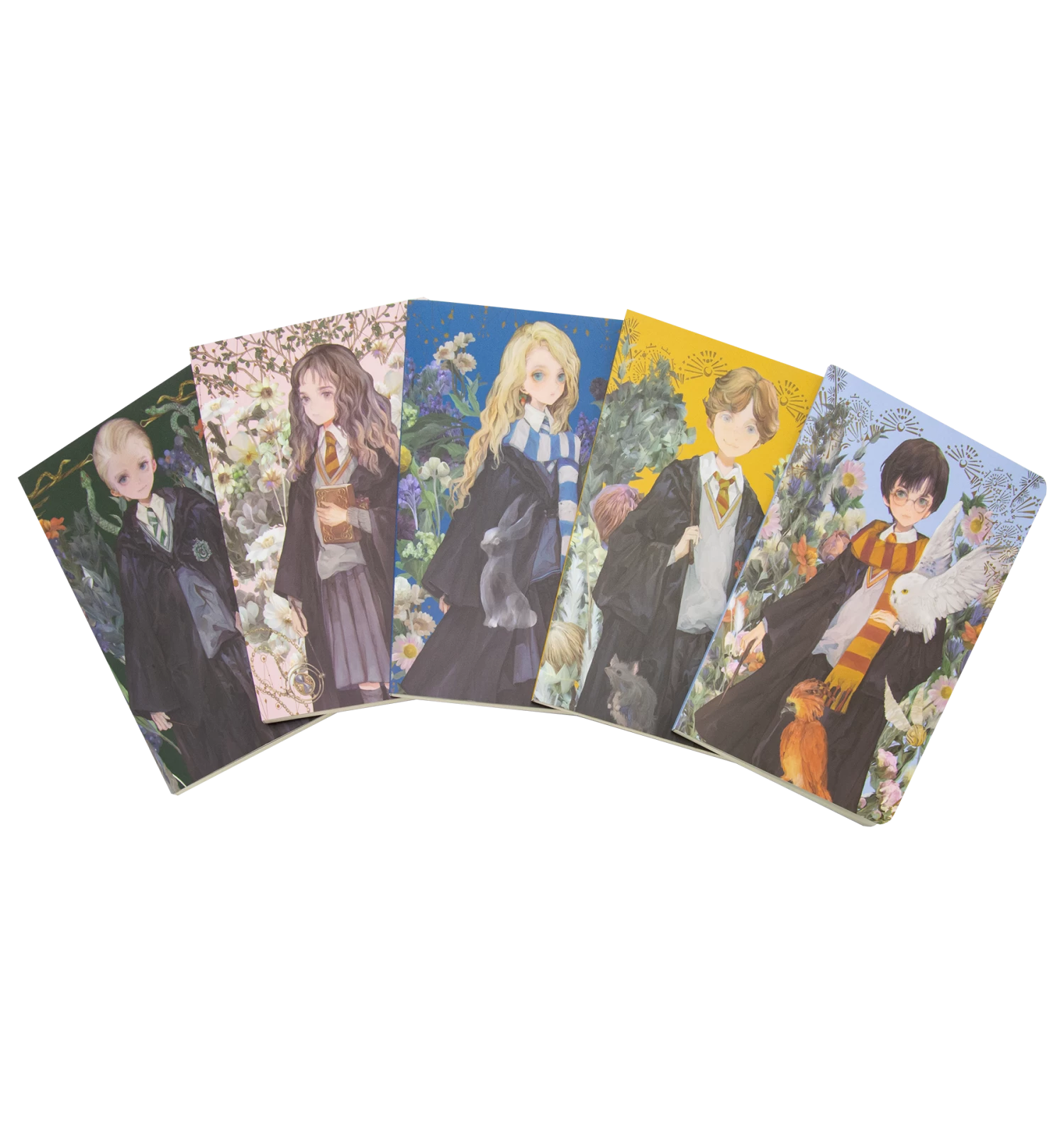 The finest Hogwarts students take centre stage in this stunning set, featuring Harry, Hermione, Ron, Luna and Draco amidst a wild and untamed magical garden of vibrant and brilliantly coloured blooms. Each illustration reflects the unique personalities and traits of the students, alongside their signature items and creatures.