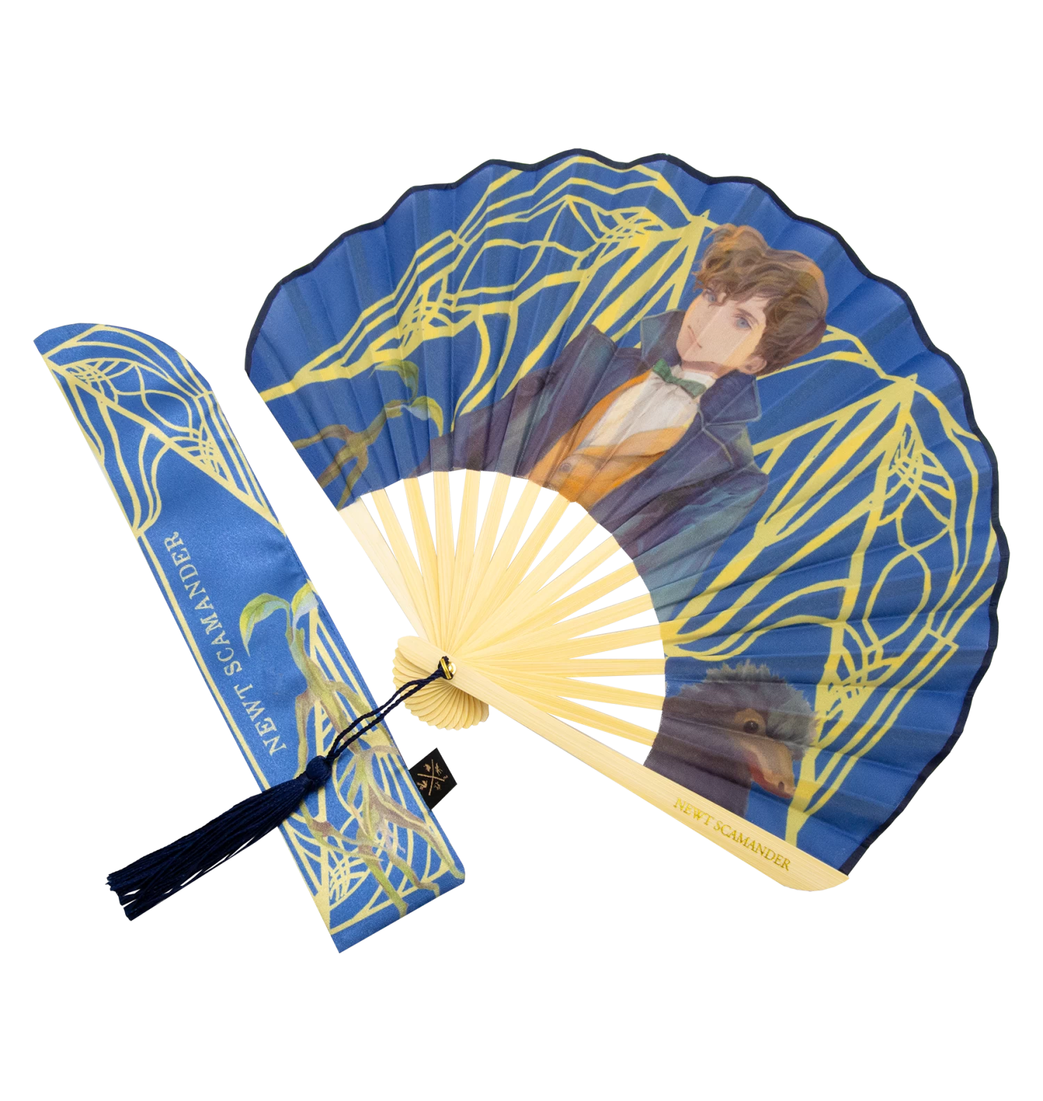 Everyone’s favourite magizoologist can be seen prominently centre, standing in front of an art deco style array of geomentric patterns. Newt is surrounded on both sides by two of the most famous magical creatures from the Fantastic Beasts films, the mischievous Niffler and Bowtruckle, Pickett. Pickett can also be found on the accompanying blue-colored fan pouch, adorned with matching geometric details. The phrase “Newt Scamander” is elegantly inscribed in gold along the fan’s handle length and printed down the pouch.